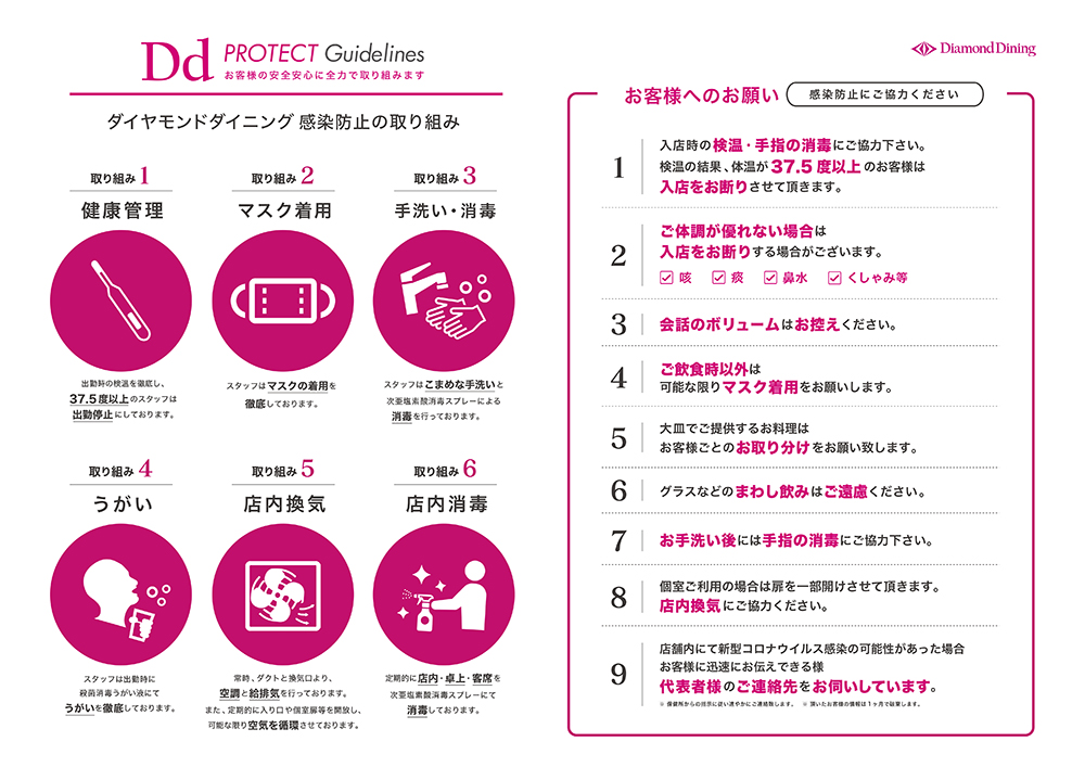 株式会社ダイヤモンドダイニングが運営する各店舗では、お客様に安心してお食事を楽しんでいただくため、行政が定める方針に基づいた感染防止対策を最大限に講じ「Dd PROTECT Guidelines」として実施しております。