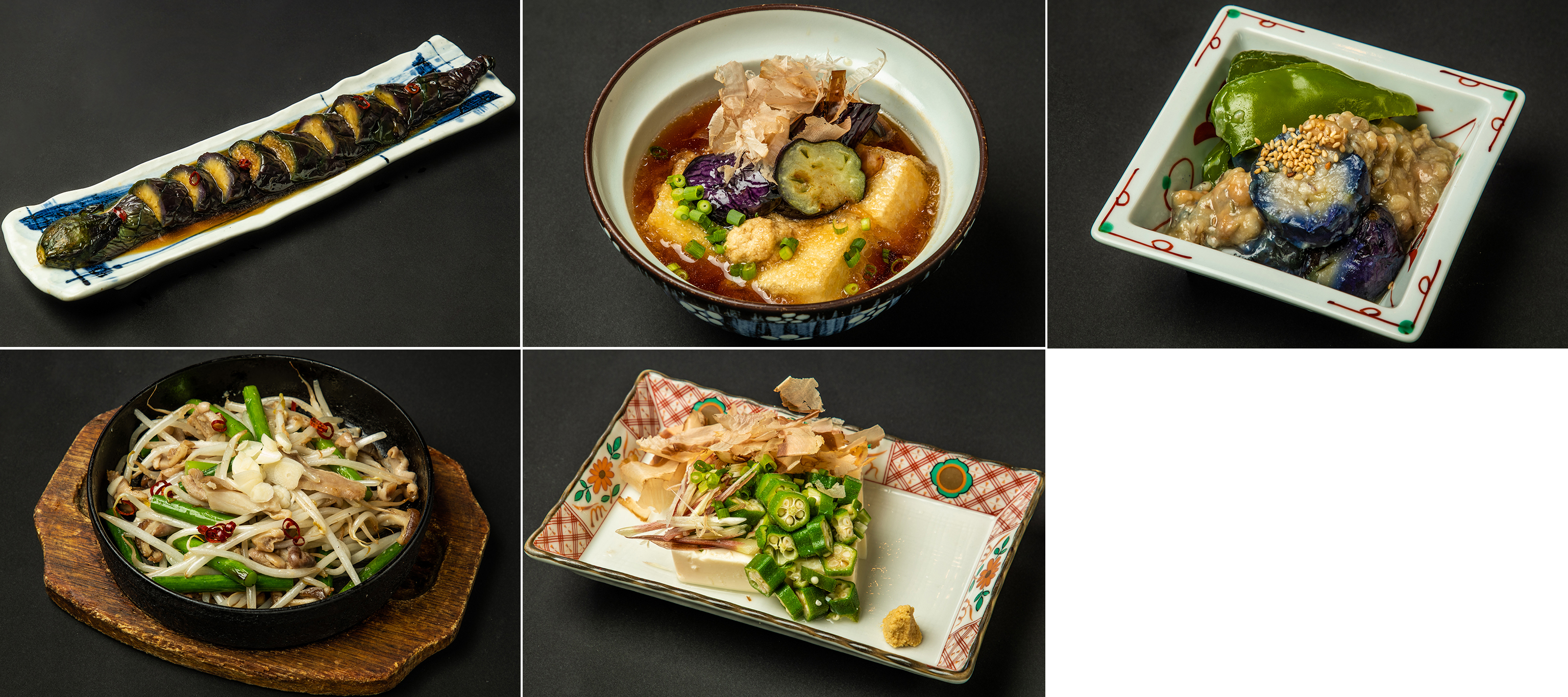 茄子に胡瓜に、オクラに茗荷。美味しい夏野菜たちにより、美味しい酒の肴が生まれました。さらに、夏バテ対策にピッタリなニンニクとニンニクの芽をたっぷり使ってモツを炒めたスタミナ満点の炒めものも!メインにもサイドにも嬉しい品々をぜひお楽しみください。