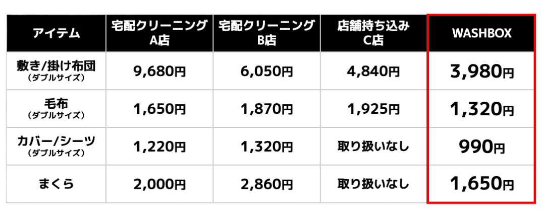 一般的なクリーニング店と比較して、WASHBOXはリーズナブルな価格設定を実現できおります。特に宅配クリーニング業者は大手物流業者に集荷・配達を委託しており、ふとんなどの大物は往路配送費が高くなります。そのため、どうしても割高な価格になっている現状がございます。その点、WASHBOXは自社物流による効率的な集荷・配送と、ふとんクリーニングに注力している工場と提携することでユーザーが日常使いできる価格帯でご提供が可能になっております。さらに新規会員登録20%OFFキャンペーンを実施しておりますので、さらにお得にご利用が可能です。