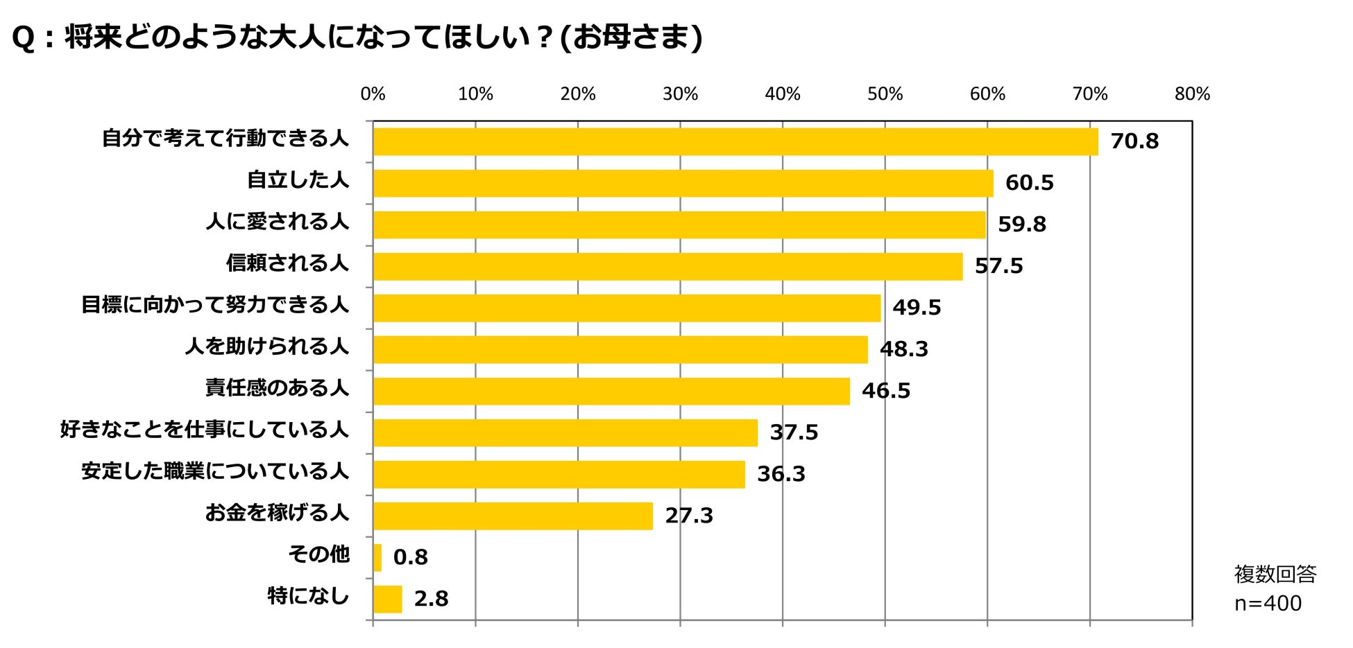 母親400名に対して、子どもに将来どのような大人になってほしいかを尋ねたところ、最も回答が多かったのは「自分で考えて行動できる人」(70.8%)で、以下、「自立した人」(60.5%)、「人に愛される人」(59.8%)だった。