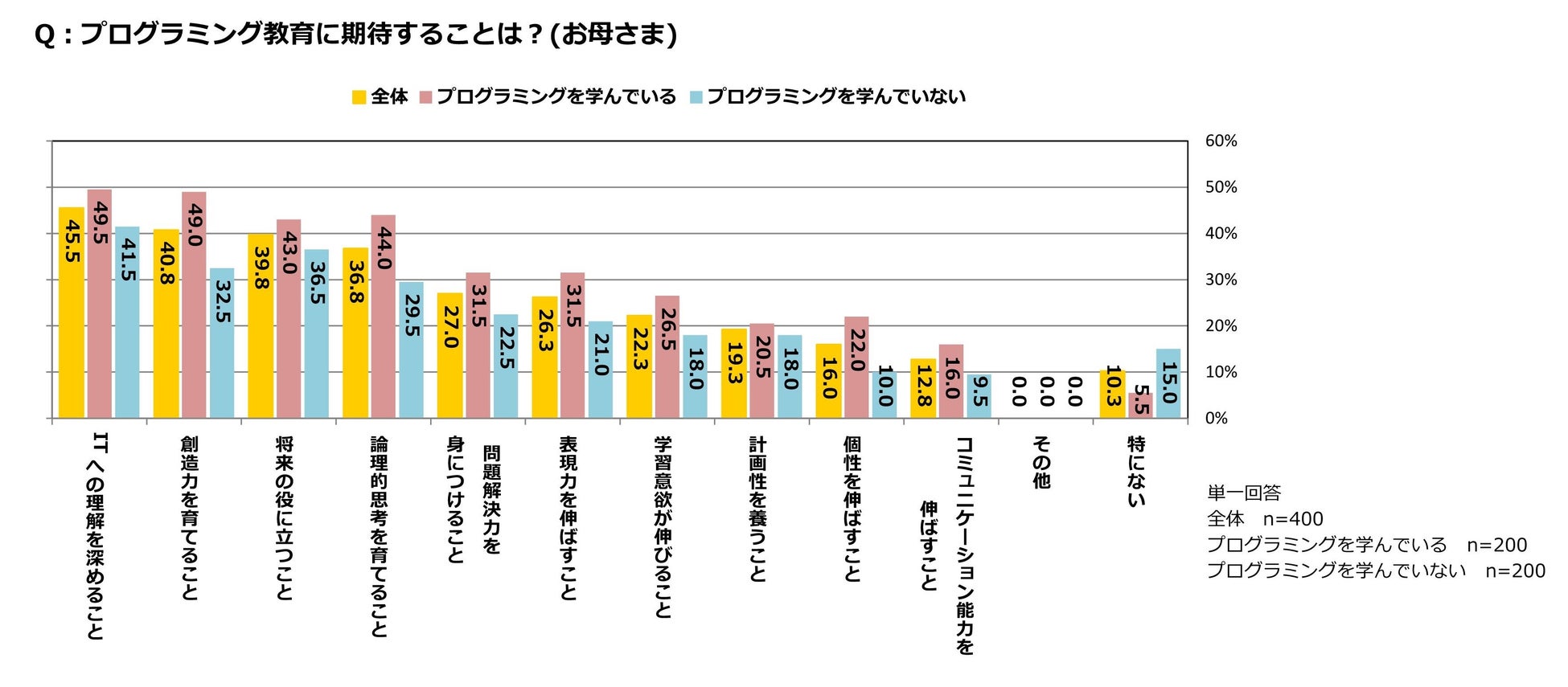 母親400名に対してプログラミング教育に期待することを尋ねたところ、最も多かった回答は「ITへの理解を深めること」(45.5%)だった。以下、「創造力を育てること」(40.8%)、「将来の役に立つこと」(39.8%)と続いた。プログラミングを学んでいると回答した子どもの母親も、「ITへの理解を深めること」(49.5%)と回答した人が最も多かったが、「創造力を育てること」(49.0%)、「論理的思考を育てること」(44.0%)、「表現力を伸ばすこと」(31.5%)、「個性を伸ばすこと」(22.0%)についても、プログラミングを学んでいない子どもの母親と比較して、回答者の割合が多かった。