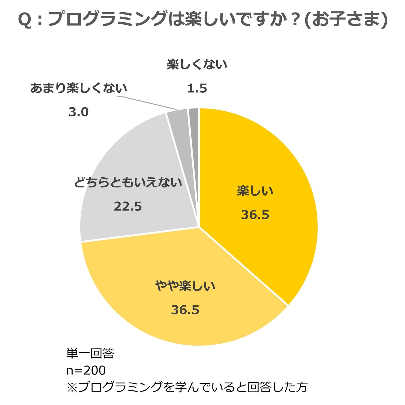 プログラミングを学んでいる子ども200名に対して、プログラミングを学ぶことは楽しいかを尋ねたところ、全体の73.0%が「楽しい」(「楽しい」36.5%、「やや楽しい」36.5%の合計)と回答した。