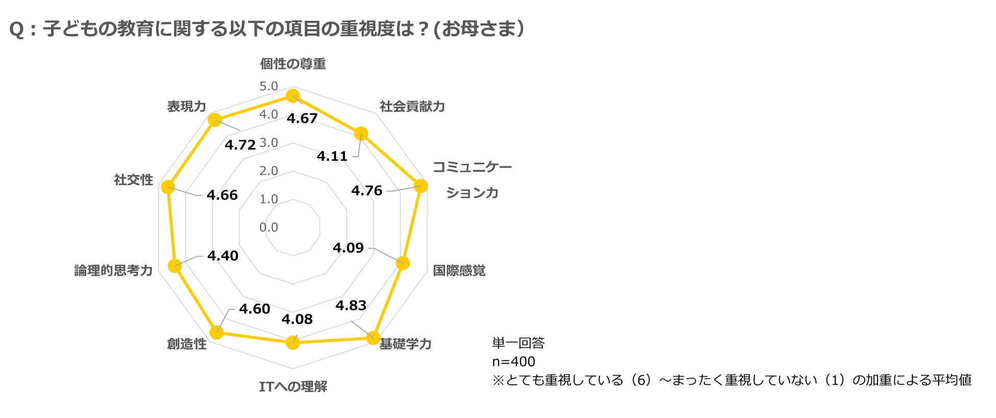 母親400名に対して、子どもの教育で重視することを尋ねた。最も重視されているのは「基礎学力」(4.83ポイント)で、以下、「コミュニケーション力」(4.76ポイント)、「表現力」(4.72ポイント)、「個性の尊重」(4.67ポイント)、「社交性」(4.66ポイント)と続いた。
