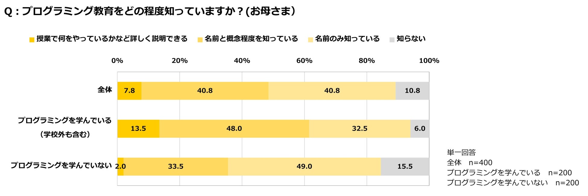 プログラミングを学んでいる子どもおよび学んでいない子ども両方の母親400名に対して、プログラミング教育についてどの程度知っているかを尋ねたところ、全体の40.8%が「名前と概念を知っている」、40.8%が「名前のみを知っている」と回答した。