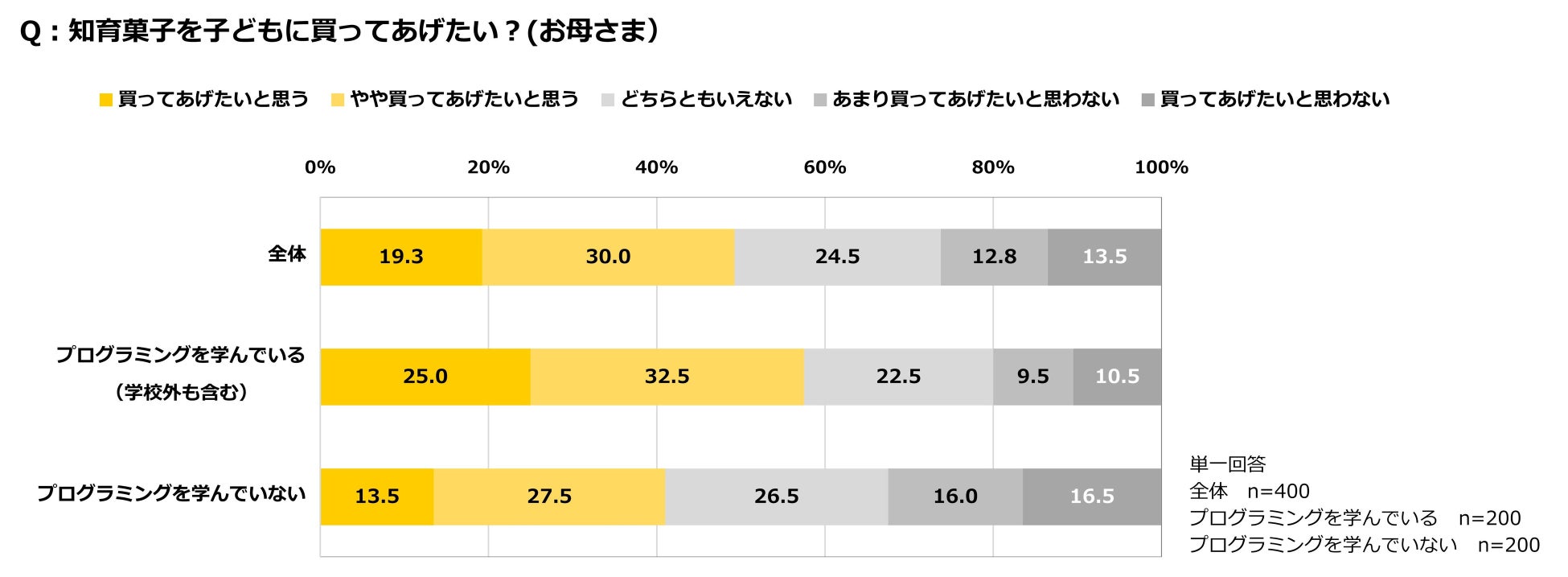 母親400名を対象に、知育菓子を子どもに買ってあげたいと思うかを尋ねたところ、「買ってあげたい」と回答した人は全体の49.3%(「買ってあげたい」19.3%、「やや買ってあげたい」30.0%)だった。プログラミングを学んでいる子どもの母親では57.5%が「買ってあげたい」(「買ってあげたい」25.0%、「やや買ってあげたい」32.5%)、学んでいない子どもの母親では41.0%が「買ってあげたい」(「買ってあげたい」13.5%、「やや買ってあげたい」27.5%)と回答し、プログラミングを学んでいる子どもの母親の方が知育菓子の購買意欲が高いことがわかった。