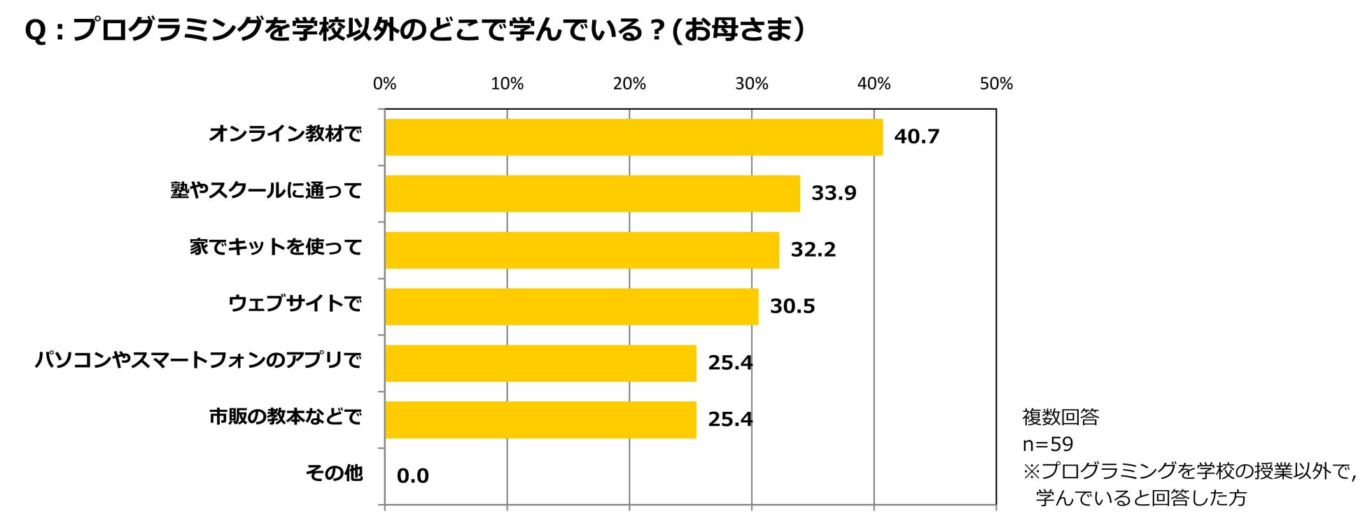 プログラミングを学んでいる子どもの約3割が「オンライン教材」や「スクールに通う」など、学校以外で学んでいると回答。