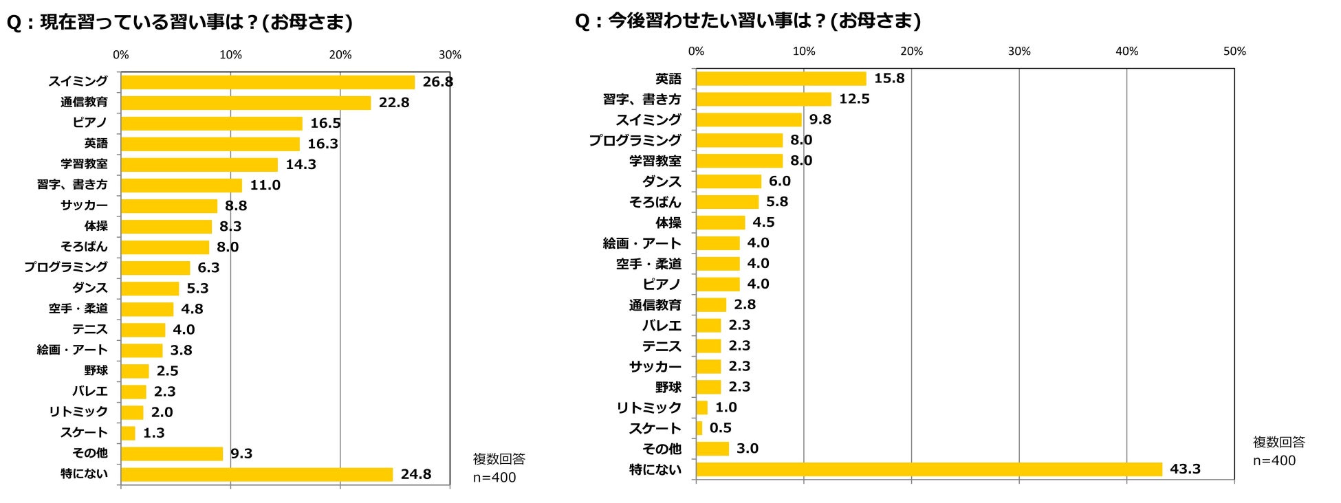 子どもが現在習っている習い事を尋ねたところ、最も多かった回答は「スイミング」(26.8%)だった。以下、「通信教育」(22.8%)、「ピアノ」(16.5%)、「英語」(16.3%)、「学習教室」(14.3%)と続いた。