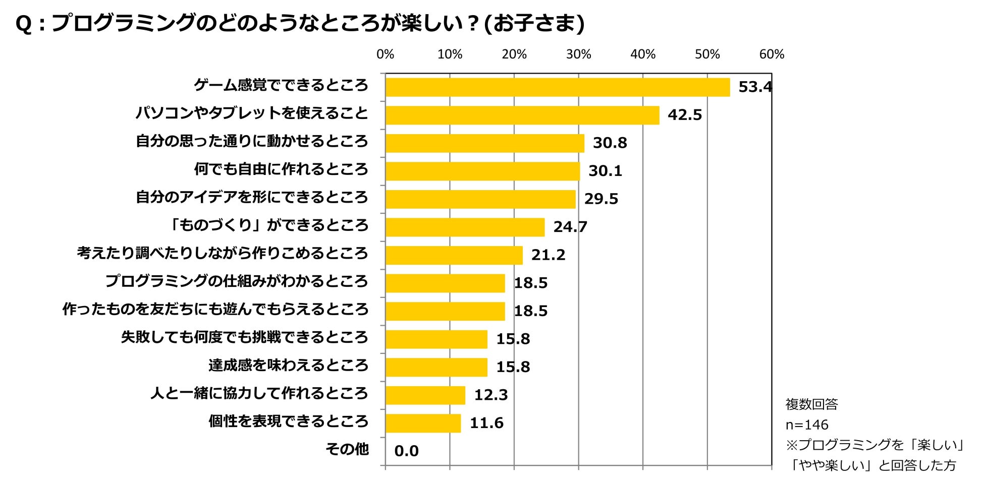 さらに、「プログラミングが楽しい」と回答した子どもに対して、どのようなところが楽しいかを尋ねた。最も多かった回答は「ゲーム感覚でできるところ」(53.4%)で、以下、「パソコンやタブレットを使えるところ」(42.5%)、「自分の思った通りに動かせるところ」(30.8%)と続いた。