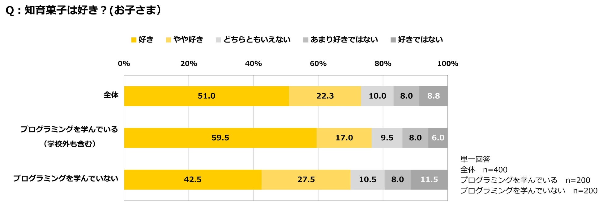 子ども400名に対して知育菓子が好きかを尋ねたところ、「好き」と回答した子どもは全体の73.3%(「好き」51.0%、「やや好き」22.3%)だった。プログラミングを学んでいる子ども200名では76.5%が「好き」(「好き」59.5%、「やや好き」17.0%)、学んでいない子では70.0%が「好き」(「好き」42.5%、「やや好き」27.5%)と回答し、プログラミングを学んでいる子どもの方が知育菓子を好む傾向にあった。