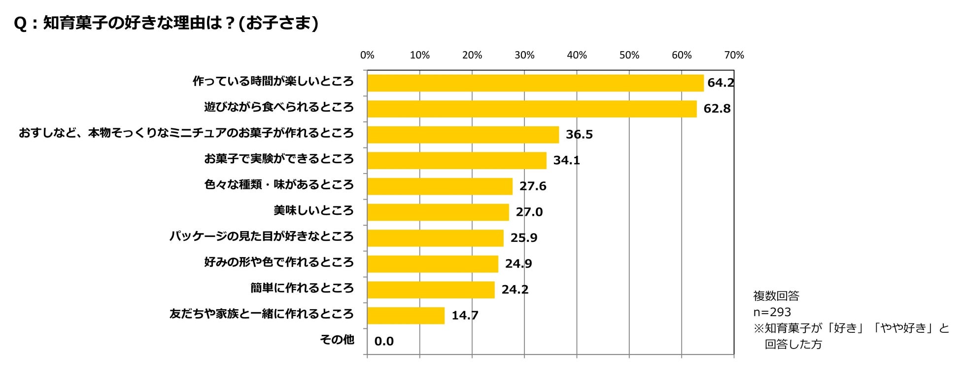 さらに、「知育菓子が好き」と回答した子どもにどのようなところが好きかを尋ねたところ、全体の64.2%が「作っている時間が楽しいところ」と回答し、62.8%が「遊びながら食べられるところ」、36.5%が「本物そっくりなお菓子が作れるところ」と回答した。