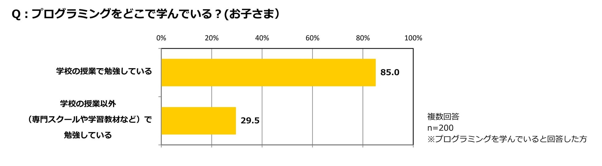 プログラミングを学んでいると回答した子ども200名に対して、どこで学んでいるかを尋ねたところ、全体の29.5%が「学校の授業以外で勉強している」と回答した。