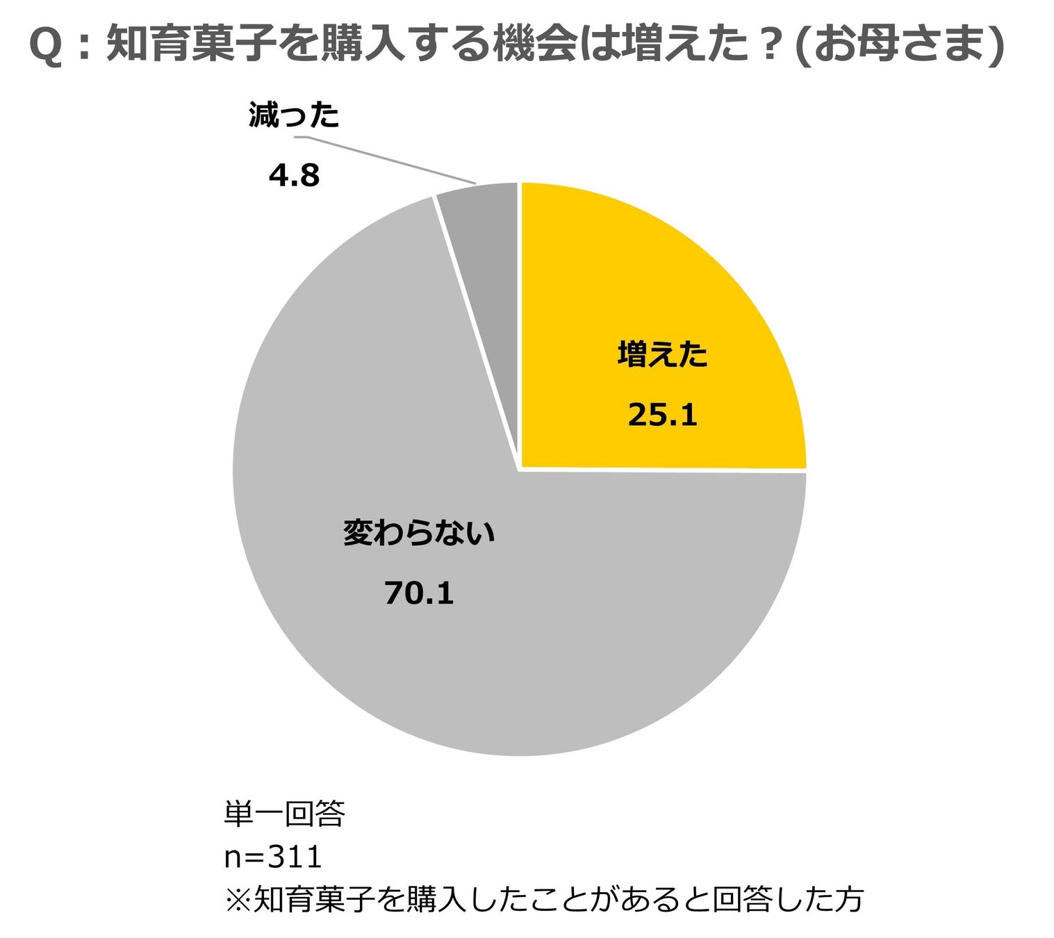 母親を対象に、コロナ禍で知育菓子を買う機会が増えたかを尋ねたところ、25.1%が「増えた」と回答した。