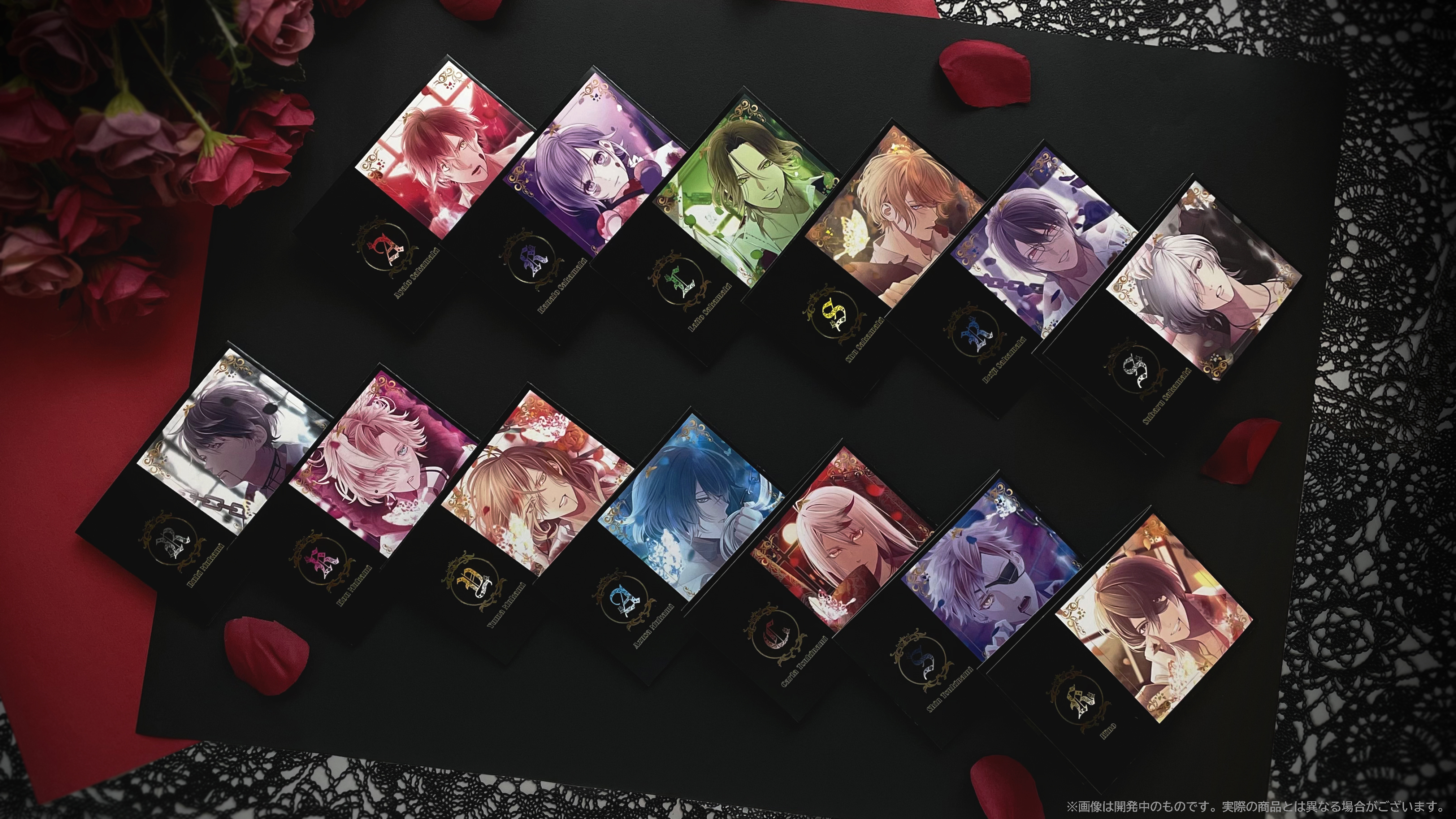 「DIABOLIK LOVERS」10周年を記念して描き下ろされた「FARFALLA LUCIO(ファルファラ ルシオ)」のイラストを使用したノベルティは3種類。いずれも、「VAMPIRE CAFE」のコース&ドリンクをオーダーした場合のみ入手できる、今回のコラボレーションだけの特典です。10周年の思い出の品として、ぜひとも貴女のお手元に…。