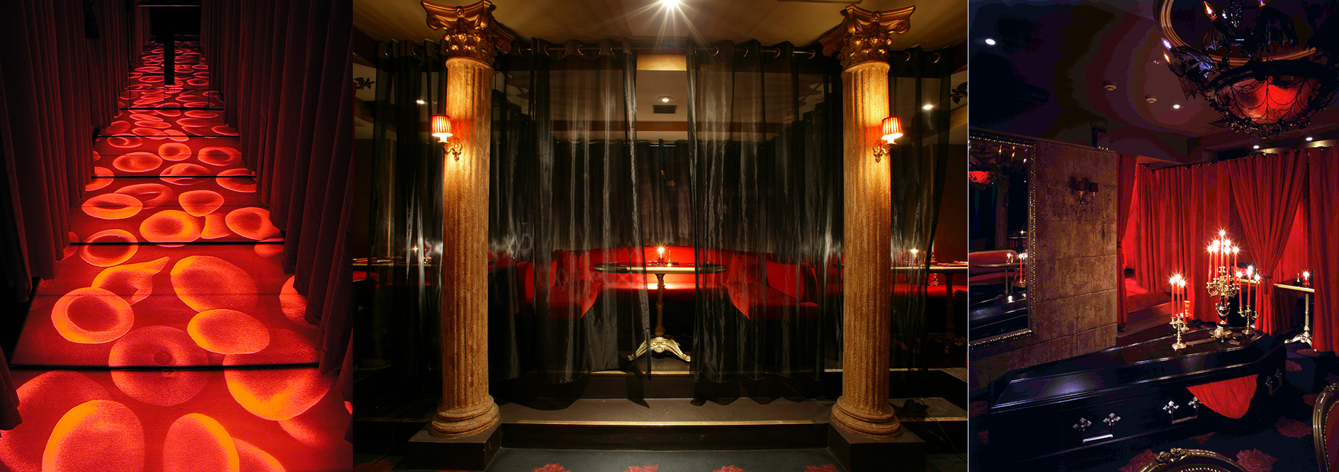 「魔除の十字架」が埋め込まれたフロントスペースに迎えられ進んでいくと、紅いベルベットのカーテンに取り囲まれ、赤血球が浮かび上がる廊下が伸びています。