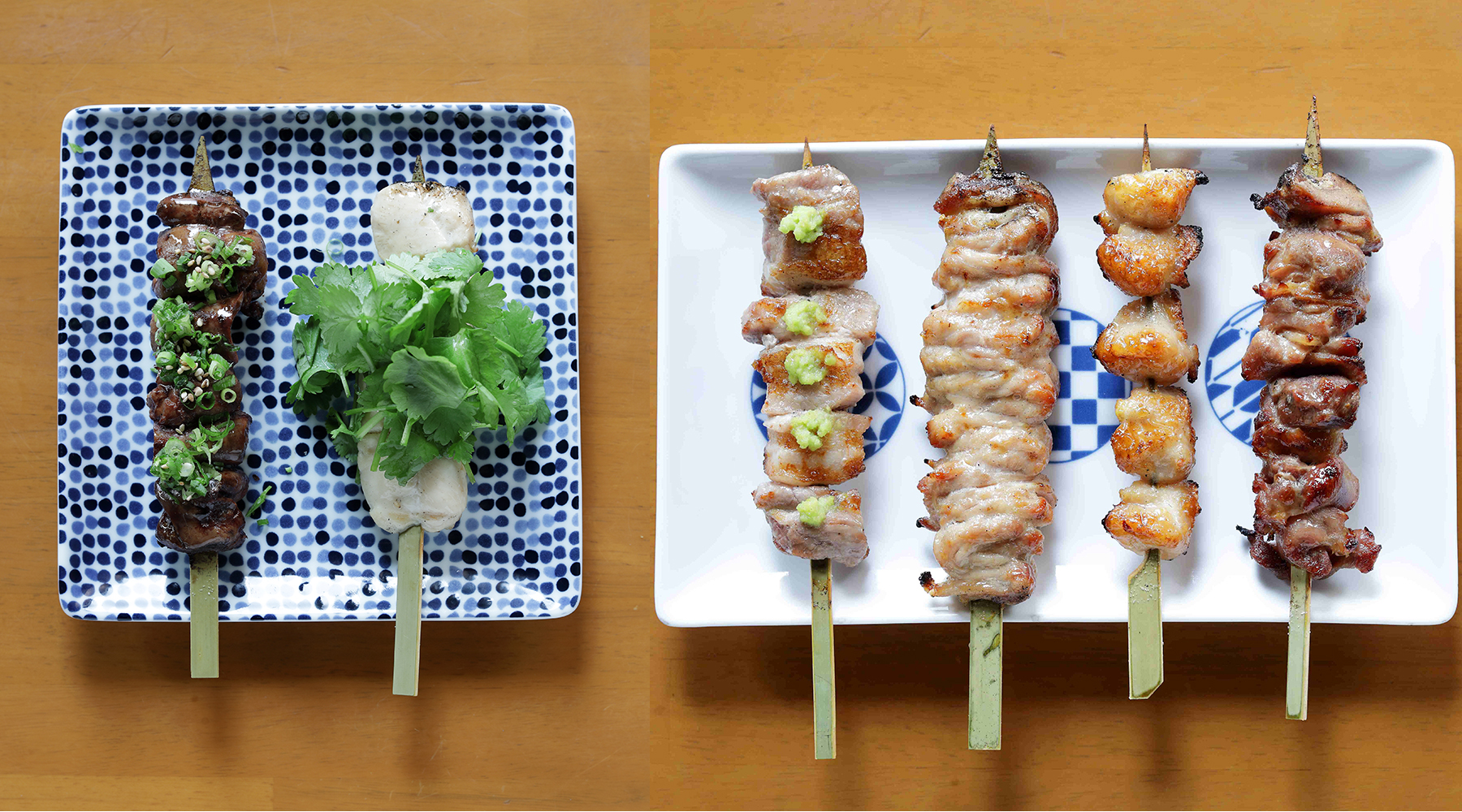 一本一本、炭の表情を見ながら、丁寧に焼き上げる串は、肉と野菜などを組み合わせ、味つけのヴァリエーションまで加えると全20種類以上をご用意しています。創業当時から変わらぬ名物であり、その旨さに絶対の自信を持ってお届けするのが国産鶏の「かしわ(250円)」、「せせり(290円)」、「白肝(390円)」の、名付けて❝三大串❞です。