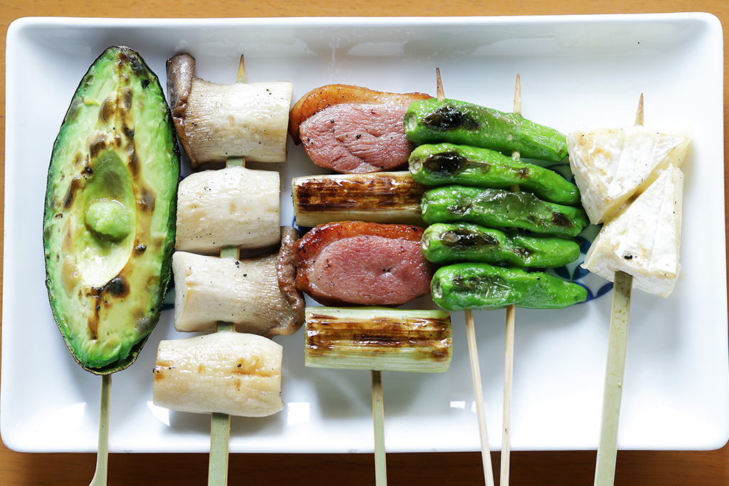 そのほか、ヘルシーさが人気ながら、わさびや梅、パクチーなどの脇役の力で旨みがぐっと膨らむ「ささみ(290円)」、ほとばしり出る美味しい脂がついついお酒を呼び込んでしまう「ぼんじり(290円)」など、鶏肉の各部位をはじめ、とろける風味が魅惑的な「アボカド」、香ばしい焼き目が食欲をそそる「エリンギ」、トロトロ食感の「おくら」(各250円 )など、王道の焼鳥串の合間に楽しみたい野菜串なども揃えています。