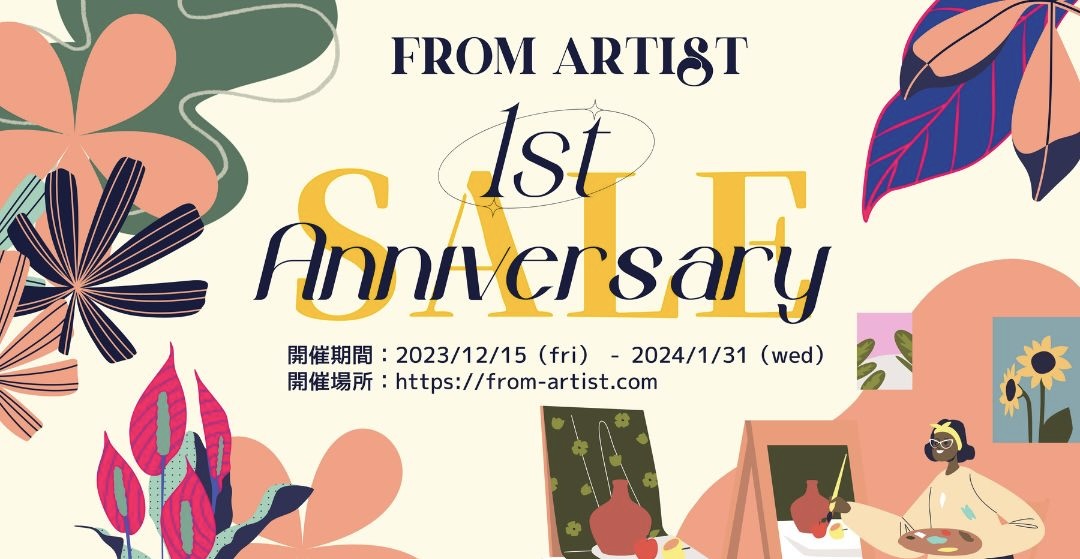 BUSCA合同会社(本社:茨城県水戸市、代表:戸井田 翔馬)は、日本全国のアーティストから好きな作品が見つけられる「FROM ARTIST」にて" 1stアニバーサリーセール "と題し、2023/12/15(fri) - 2024/1/31(wed)セールイベントを開催致します。