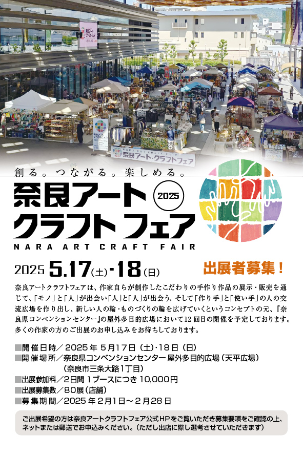 奈良アートクラフトフェアは、作家自らが制作したこだわりの手作り作品の展示・販売を通じて、「モノ」と「人」が出会い「人」と「人」が出会う、そして「作り手」と「使い手」の人の交流広場を作り出し、新しい人の輪・ものづくりの輪を広げていくというコンセプトの元、『奈良県コンベンションセンター』の屋外多目的広場において12回目の開催を予定しております。多くの作家の方のご出展のお申し込みをお待ちしております。