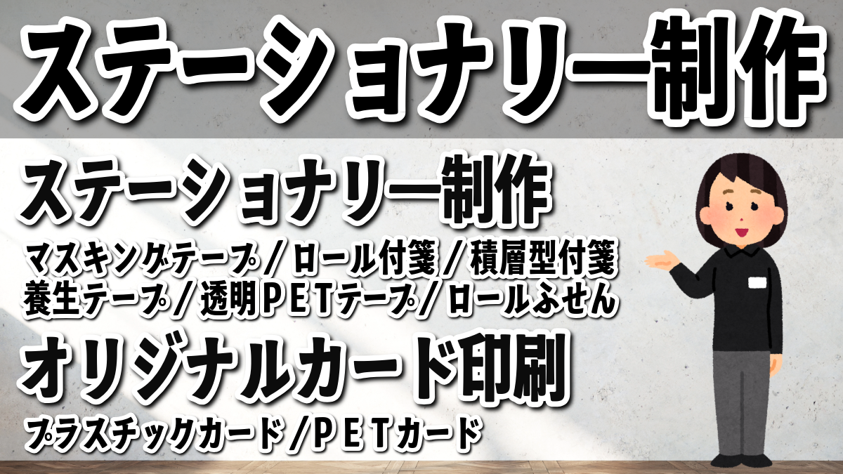 ロール付箋、マスキングテープ、透明PETテープ、養生テープ、巻物型付箋紙、積層型付箋紙でのステーショナリー制作が可能です。コンサートグッズ制作、ライブグッズ制作、アーティストグッズ制作、野球グッズ制作、サッカーグッズ制作、バスケグッズ制作、バレーボールグッズ制作、空手グッズ制作、体操グッズ制作、卓球グッズ制作、柔道グッズ制作、剣道グッズ制作、ミュージアムグッズ制作、美術館グッズ制作、美術展グッズ制作、博物館グッズ制作、科学館グッズ制作、動物園グッズ制作、水族館グッズ制作、水族館グッズ制作、アニメグッズ制作、キャラクターグッズ制作、ノベルティグッズ制作が可能です。JANシール貼り、証紙貼りが可能です。カートンラベル貼り可能です。全国発送可能です。専属担当や匠カスタマイズ仕様マイスターが、商品企画、デザイン、版下データご作成、DTP、ご入稿、印刷、加工、進行管理、生産管理、進捗管理、セット、梱包、等トータル提案(Proposal Suggestion Suggest Recommend)and トータルサポート(total support)します。柔軟なサポートを心掛けております。実店舗での対面お打ち合わせも可能です。実店舗で、文具やステーショナリ―のリアルサンプルや、現物サンプルをご覧いただくことも可能です。