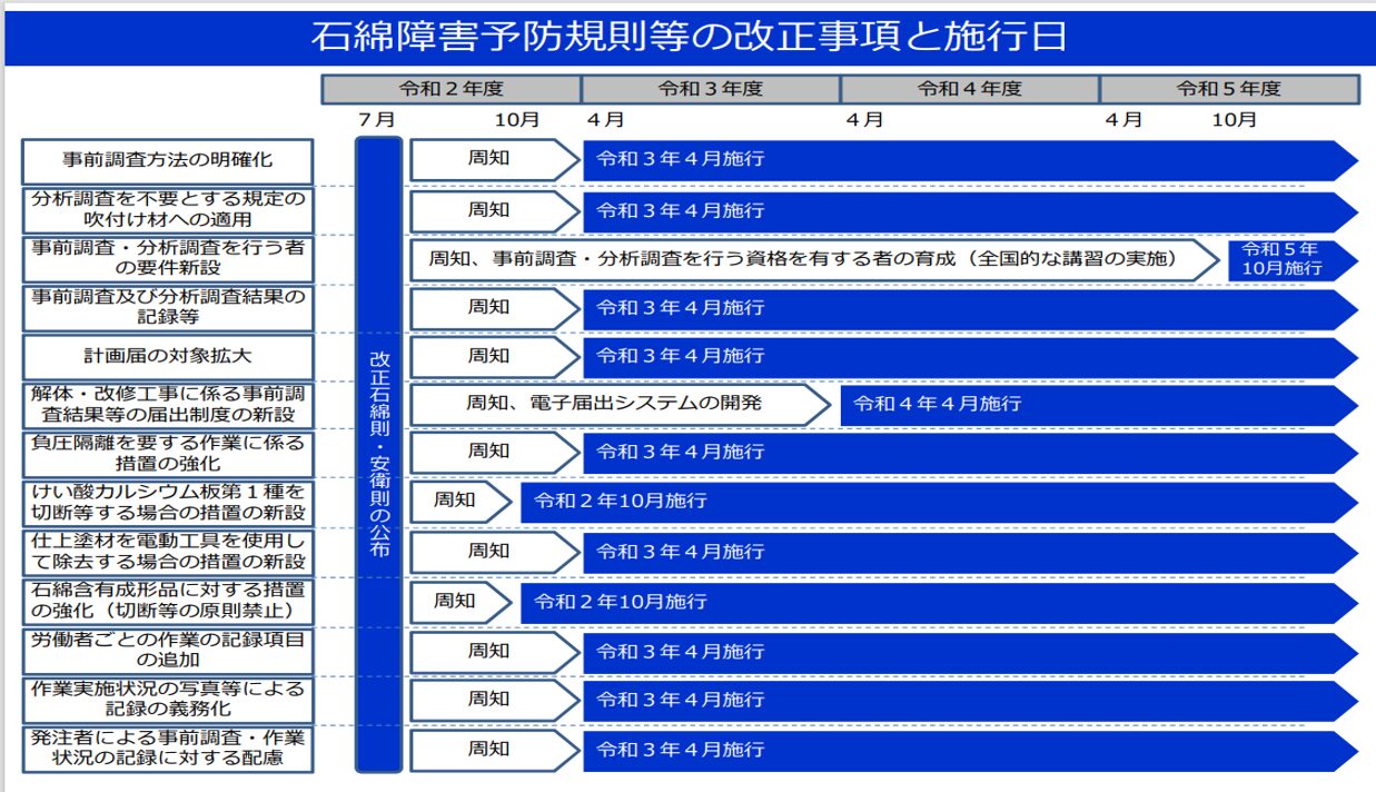 2020年7月に石綿障害予防規則等が改正され、建築物の解体・改修作業従事者に対しても、作業前の「事前調査」や作業環境管理、作業管理、そして作業主任者選任等の厳格な管理が課せられました。