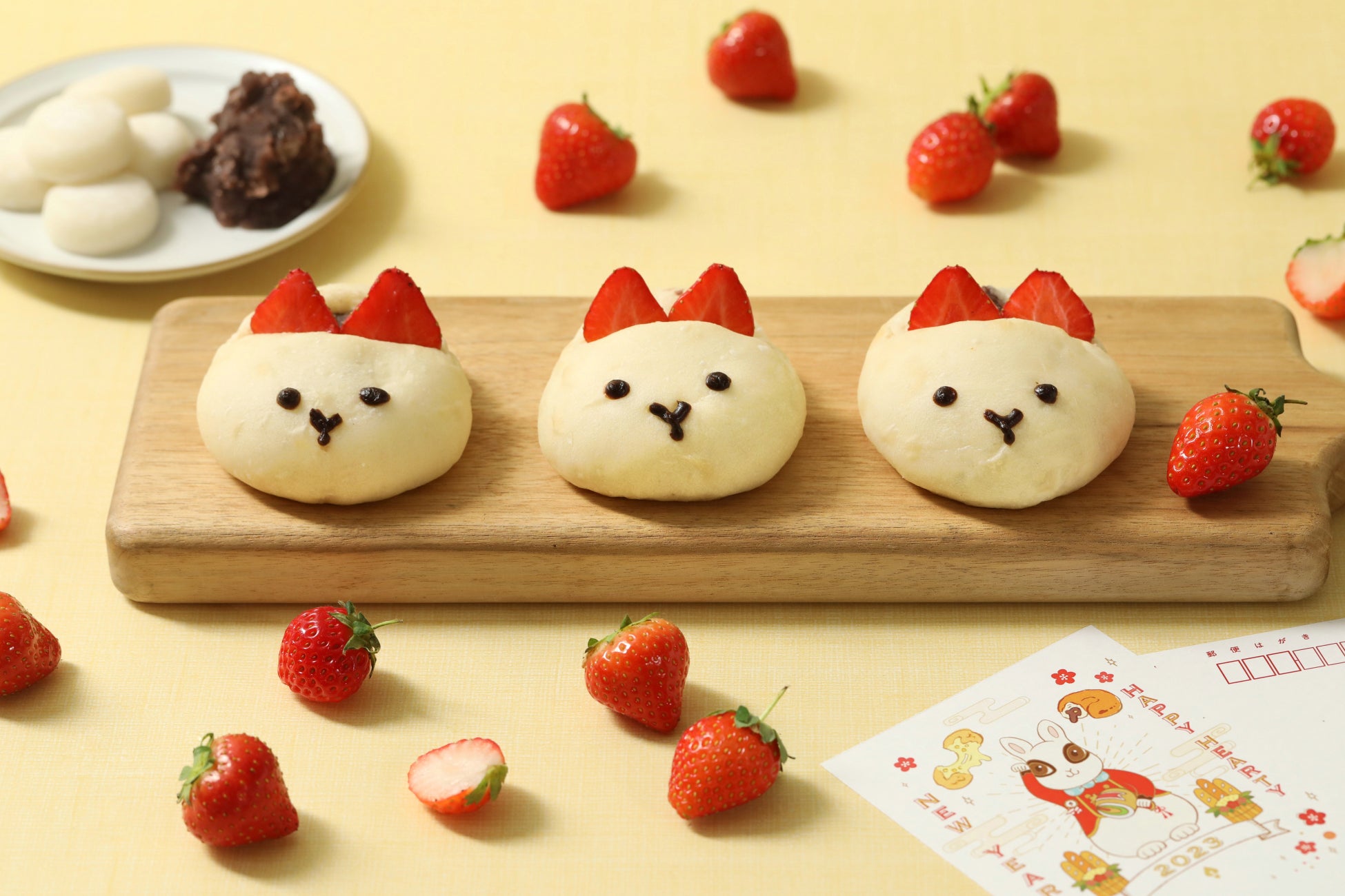 ハートブレッドアンティークから、2023年の干支・卯(うさぎ)にちなんだ「白うさぎのいちご大福パン」が登場いたします。まるっとかわいらしいフォルムのパン生地に、いちごでうさぎの耳を表現いたしました。