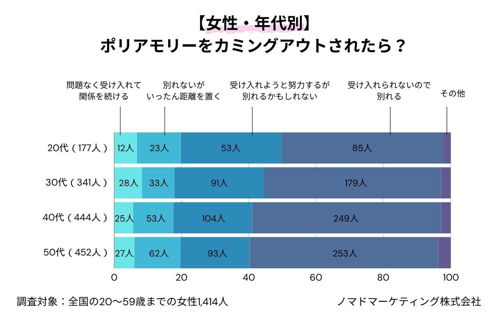 30代以降は、「問題なく受け入れて関係を続ける」の回答割合がぐんと上がる結果に。ポリアモリーという考え方を受け入れられない人は一定数いるものの、関係を続ける・別れないという選択をした人が多くなりました。