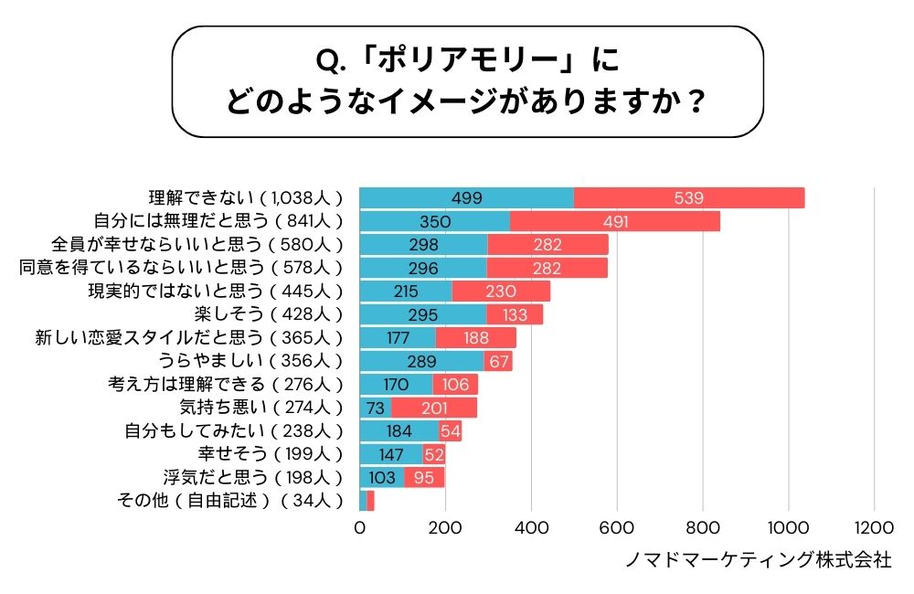 「理解できない」「自分には無理だと思う」など、ネガティブなイメージが大きく票を集めた一方で、「全員が幸せならいいと思う」「同意を得ているならいいと思う」と、当事者への理解を示す結果となりました。