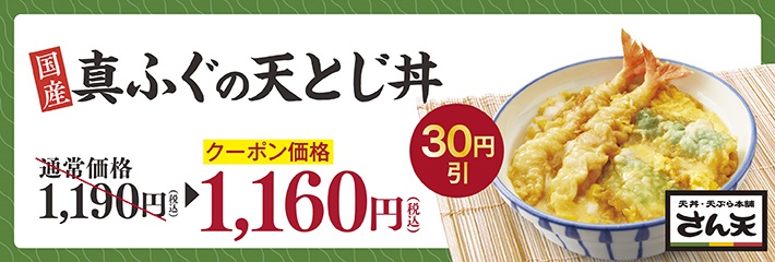更に「天丼・天ぷら本舗 さん天」公式アプリでは、フェア商品でお使いいただける30円引きクーポンを配信いたします。ぜひ、お得にご利用ください。