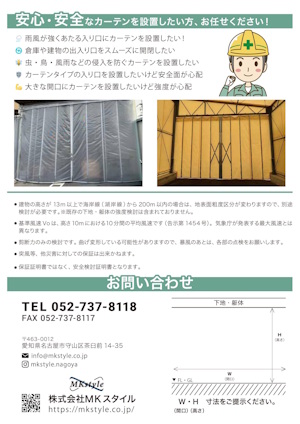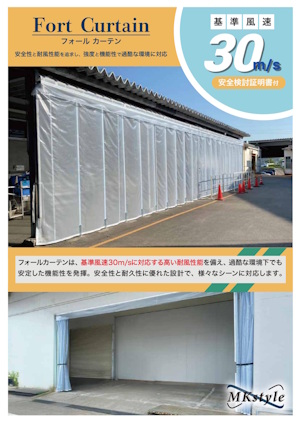 株式会社MKスタイル(本社:名古屋市守山区)は、2025年2月4日(火)より、新製品「フォールカーテン」に関するカタログをご案内いたします。基準風速30m/sに対応した耐風性能を備え、過酷な環境下でも高い安全性と機能性を発揮するフォールカーテン。本カタログでは、製品の特長や用途、豊富なカラーバリエーションについて詳しくご紹介しております。施設や現場での課題解決に向けて、ぜひご活用ください。