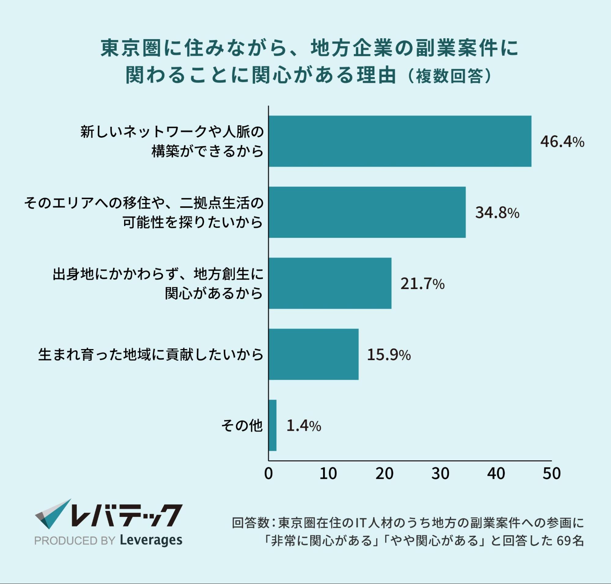 東京圏に住むIT人材に対し、「副業として、地方企業の案件にリモートで携わることに関心があるか」聞いたところ、46.4%の方が関心があると回答しました。その理由としては「新しいネットワークや人脈の構築ができるから(46.4%)」が最も多く、「そのエリアへの移住や、二拠点生活の可能性を探りたいから(34.8%)」が続きます。