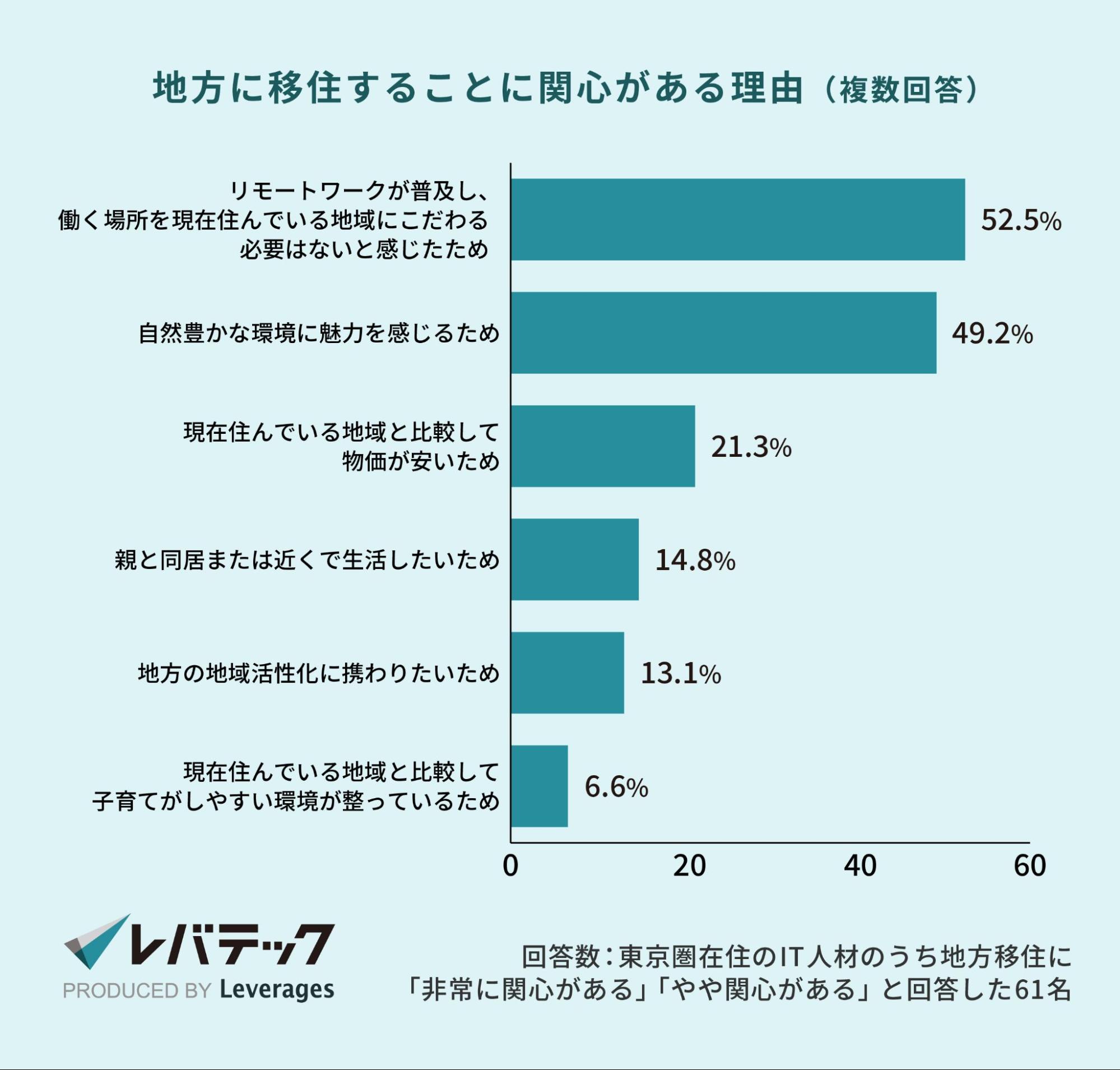 地方移住に関心がある理由は「リモートワークが普及し、働く場所を現在住んでいる地域にこだわる必要はないと感じたため(52.5%)」が最多となり、「自然豊かな環境に魅力を感じるため(49.2%)」が続きます。