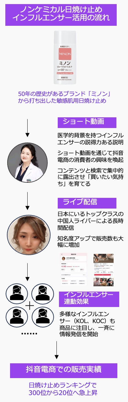第一三共ヘルスケアは抖音電商と協力して、まず医学的なバックグラウンドを持つインフルエンサーに依頼してノンケミカルの日焼け止めを選ぶメリットが伝わるショート動画を作成してもらった。その説得⼒ある動画は消費者の関心を引き付け、「買いたい気持ち」が高まる。その後、⽇本在住のトップクラスの中国⼈ライバーによる⻑時間配信を実施し、さらに知名度向上と販売増加を実現した。この取り組みにより、最終的に「ミノンUVマイルドミルク」の売上高に大きく貢献し、ミノンは日焼け止めのランキングで300位から20位にまで急上昇したという。