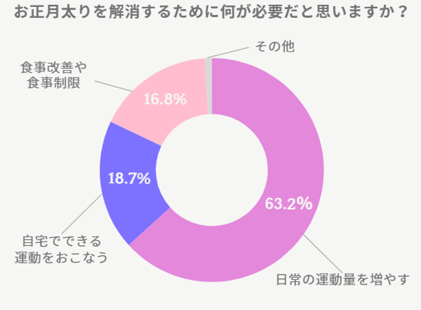 「お正月太りを解決するために必要なことは何か?」という質問に対しては、16.8%の人が「食事改善・食事制限」と回答。このように、お正月太りの最も大きな原因である“食生活” に関する改善が必要だと実感する人もいる一方、「日常生活の運動量を増やす」が63.2%、「自宅でできる運動を行う」が18.7%と、全体の81.9%が“お正月太り解消” には「運動」が必要だと感じてることがわかった。