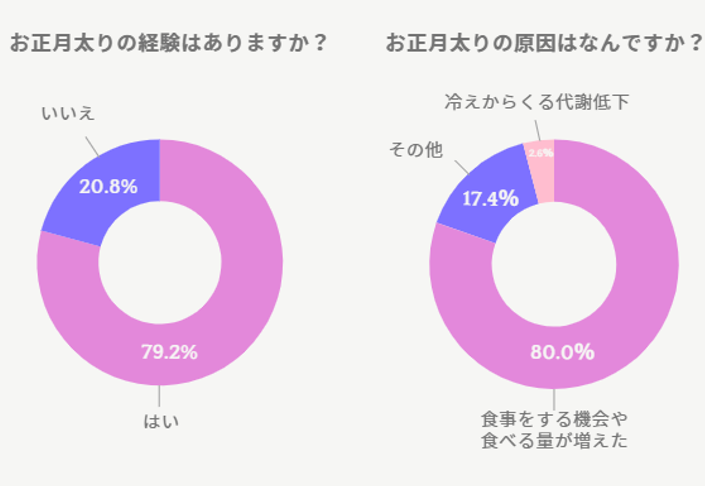「お正月太りを経験した」と回答した人が全体79.2%という結果に。また「お正月太り経験者」のうち80%が「食事の機会・量が増えたこと」が、お正月太りの原因であったと回答。豪華でボリュームのある食事になりやすいお正月、その影響が色濃く出た。