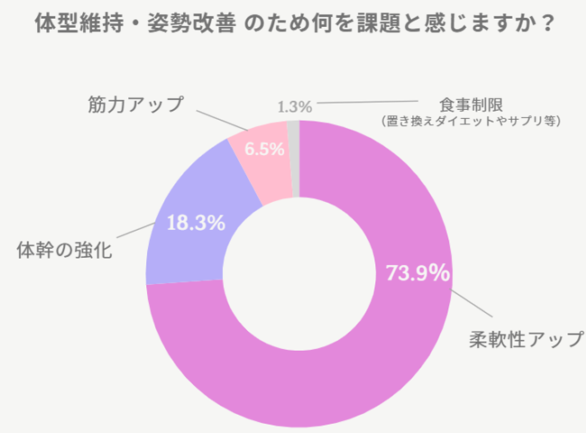 4.「体型維持・姿勢改善に向けての課題」をリサーチした結果、73.9%が「柔軟性アップ」、18.3%が「体幹の強化」と回答