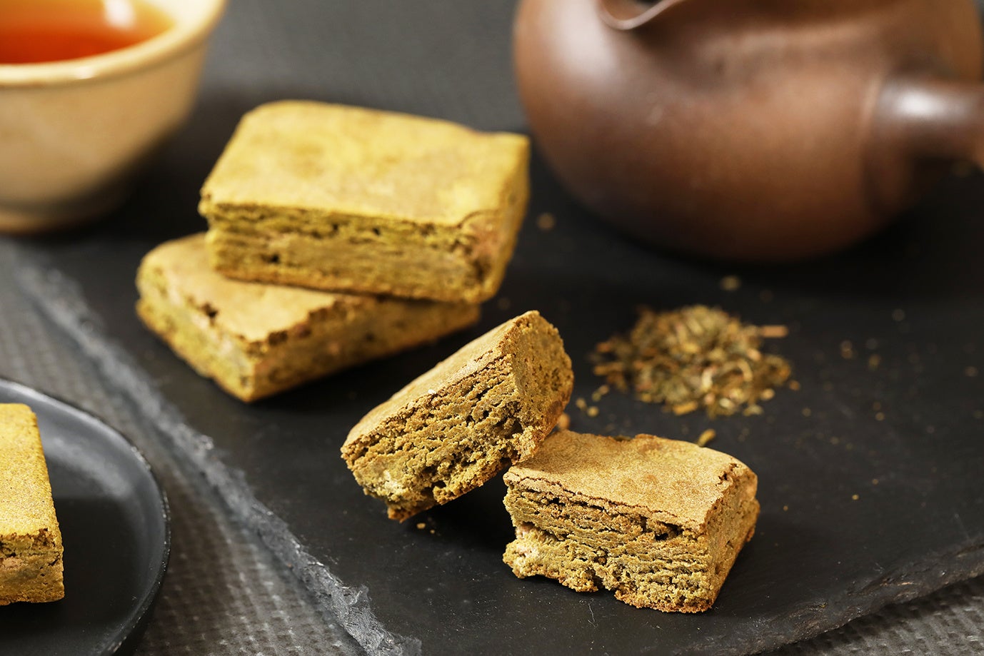 - ホワイトチョコレートをベースにしたブラウニー生地に、名古屋の老舗お茶専門店「妙香園」のほうじ茶を練り込みました。