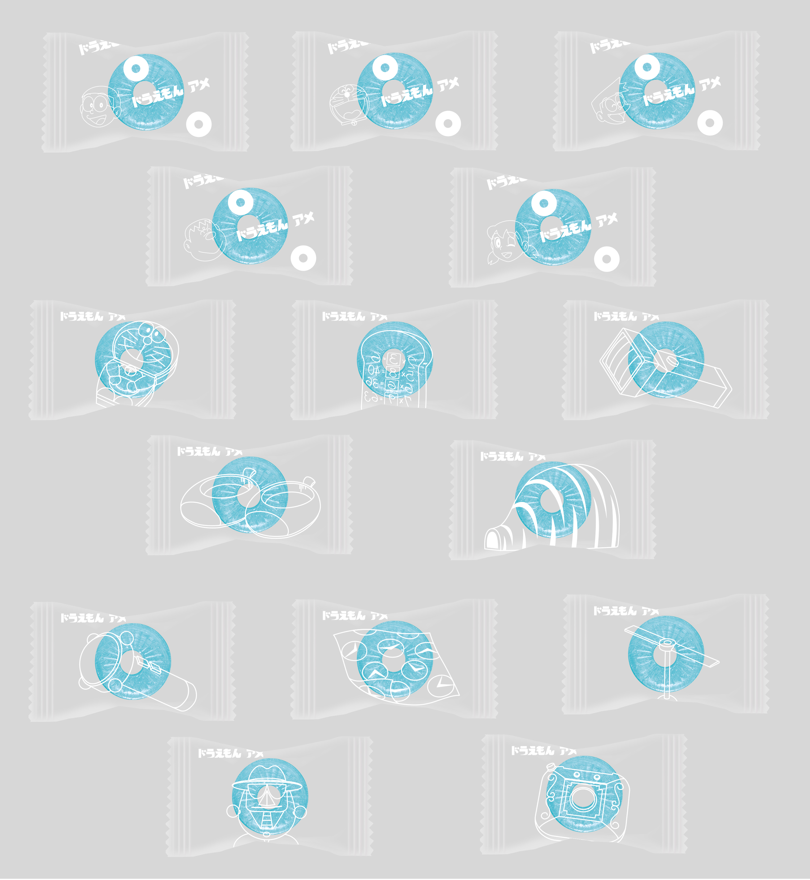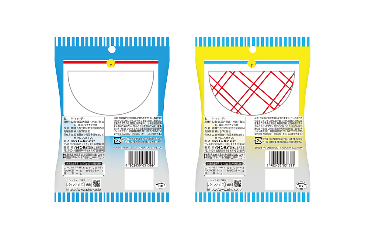 個包装は全15種類。“パインアメフォント”を使用したロゴにドラえもん・のび太・しずか・ジャイアン・スネ夫のイラストを組み合わせたパインアメ風デザインが5種と、ひみつ道具のデザイン10種をランダムに封入しています。