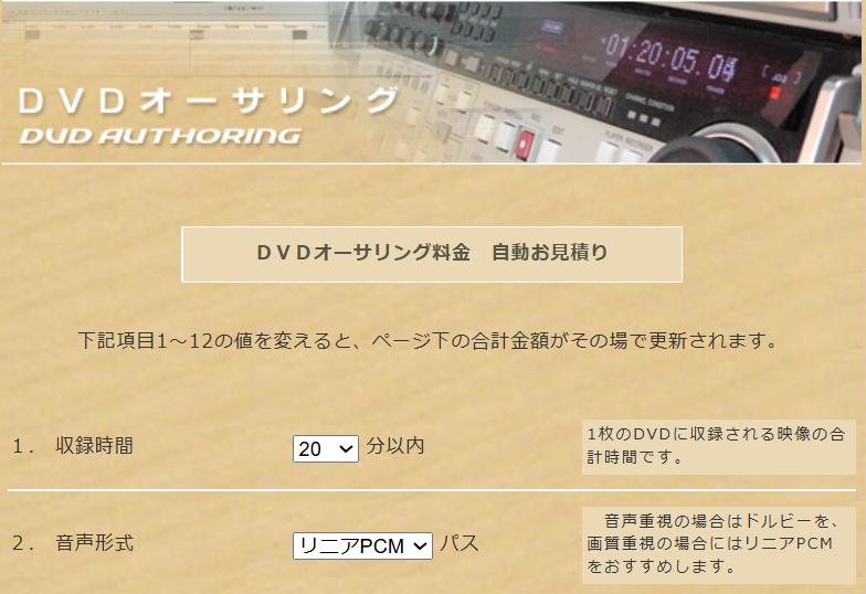下記のリンク先より①~⑫のDVD仕様を自動お見積もりで入力してください。