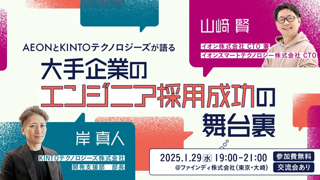 「はたらいて、笑おう。」をビジョンに掲げるパーソルグループのパーソルイノベーション株式会社 TECH PLAY Company(本社:東京都港区、TECH PLAY Company代表:片岡 秀夫)が運営する、27万人の会員をもつテクノロジー人材のエンパワーメントと企業のDX組織構築の支援サービスを提供する『TECH PLAY(テック プレイ)』※とファインディ株式会社は、2025年1月29日(水)19:00より、AEON株式会社とKINTOテクノロジーズ株式会社をゲストに迎え、「大手企業のエンジニア採用成功の舞台裏」と題したオフラインセミナーを開催します。当日は、イベント後に交流会も開催予定です。 ※2024年9月時点