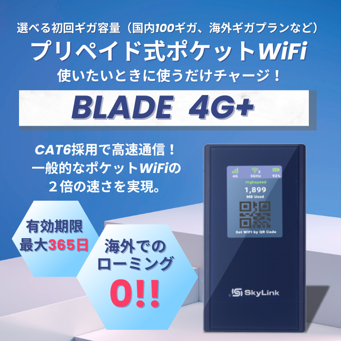 Skylink Global Japanは、本日プリペイド式ポケットWiFi「BLADE 4G+」を発売いたします。買い切り型ポケットWiFiのため契約・返却・月額全て不要。さらに最大下り速度300Mbps、バッテリーは大容量の4000mAhです。本体+ギガのお得なセットプランをたくさんご用意いたしました!