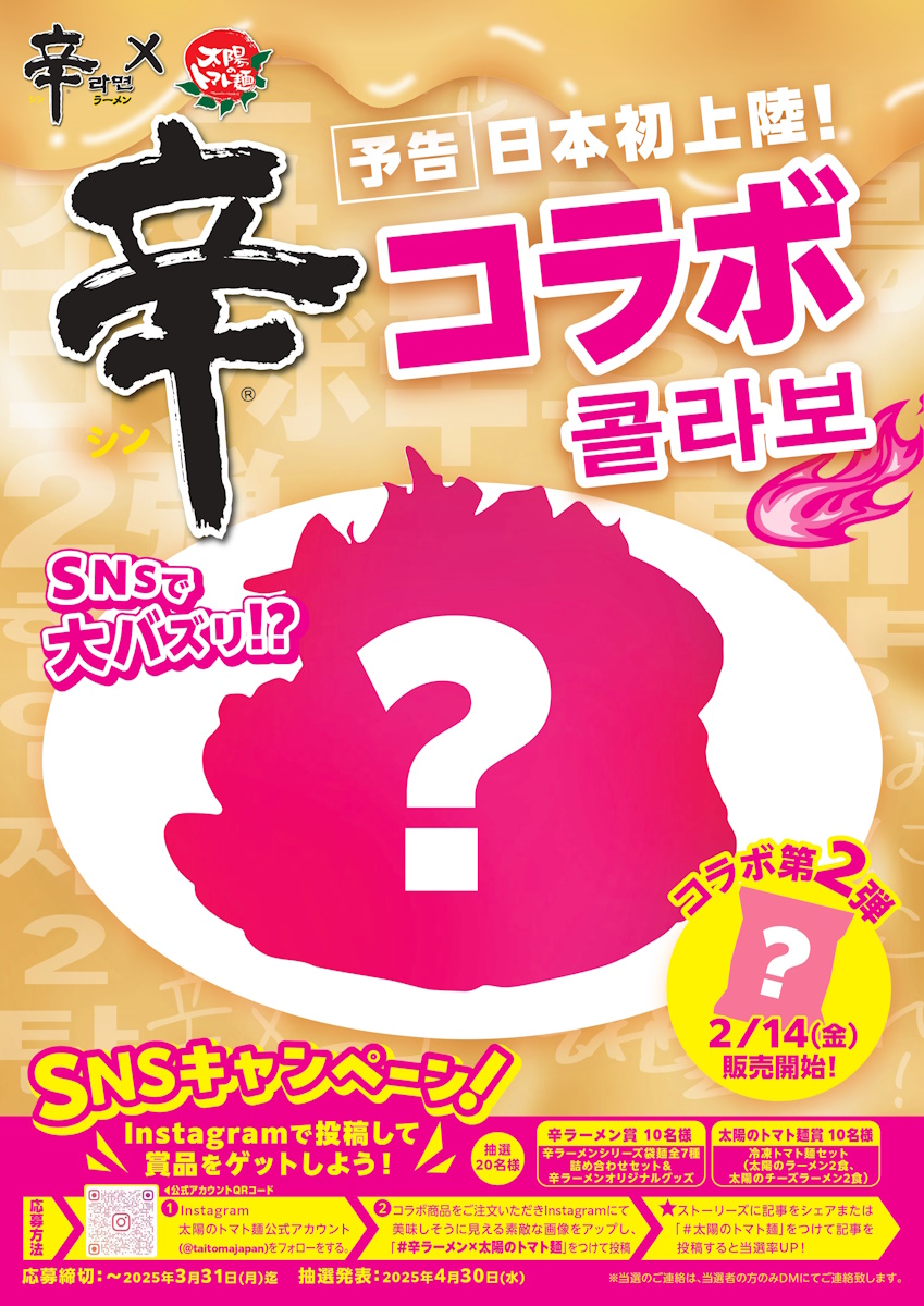 「辛ラーメン×トマト麺」コラボを記念してSNSキャンペーンを開催いたします。応募方法は、Instagramの太陽のトマト麺公式アカウントをフォローして、“#辛ラーメン_太陽のトマト麺”とともに「辛ラーメン×トマト麺」コラボメニューの写真を投稿。辛ラーメンシリーズ袋麺全7種&オリジナルグッズが詰まった「辛ラーメン賞」と、冷凍の太陽ラーメンとチーズラーメン各2食をセットにした「太陽のトマト麺賞」が、それぞれ抽選で10名に当たるスペシャルなキャンペーンです。