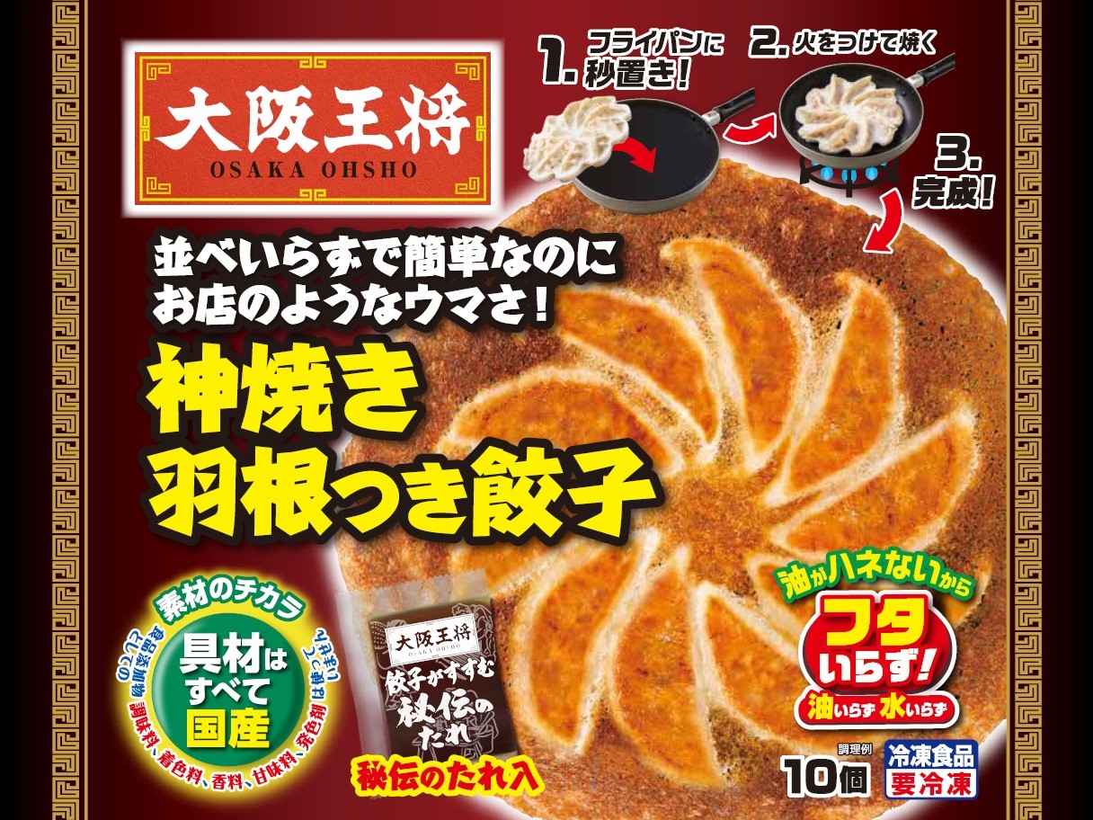 2024年春に登場し、並べいらずの簡単調理が好評の円盤型餃子が、フタいらずに進化して新登場いたします。大阪王将の店舗では、職人がこんがりと均一に焼き目をつけた焼き方を徹底しており、これを“神焼き”と呼んでいることから、商品名も『神焼き羽根つき餃子』に変更。野菜と肉のバランスも店舗さながら、さらに簡単調理でお楽しみいただけます。