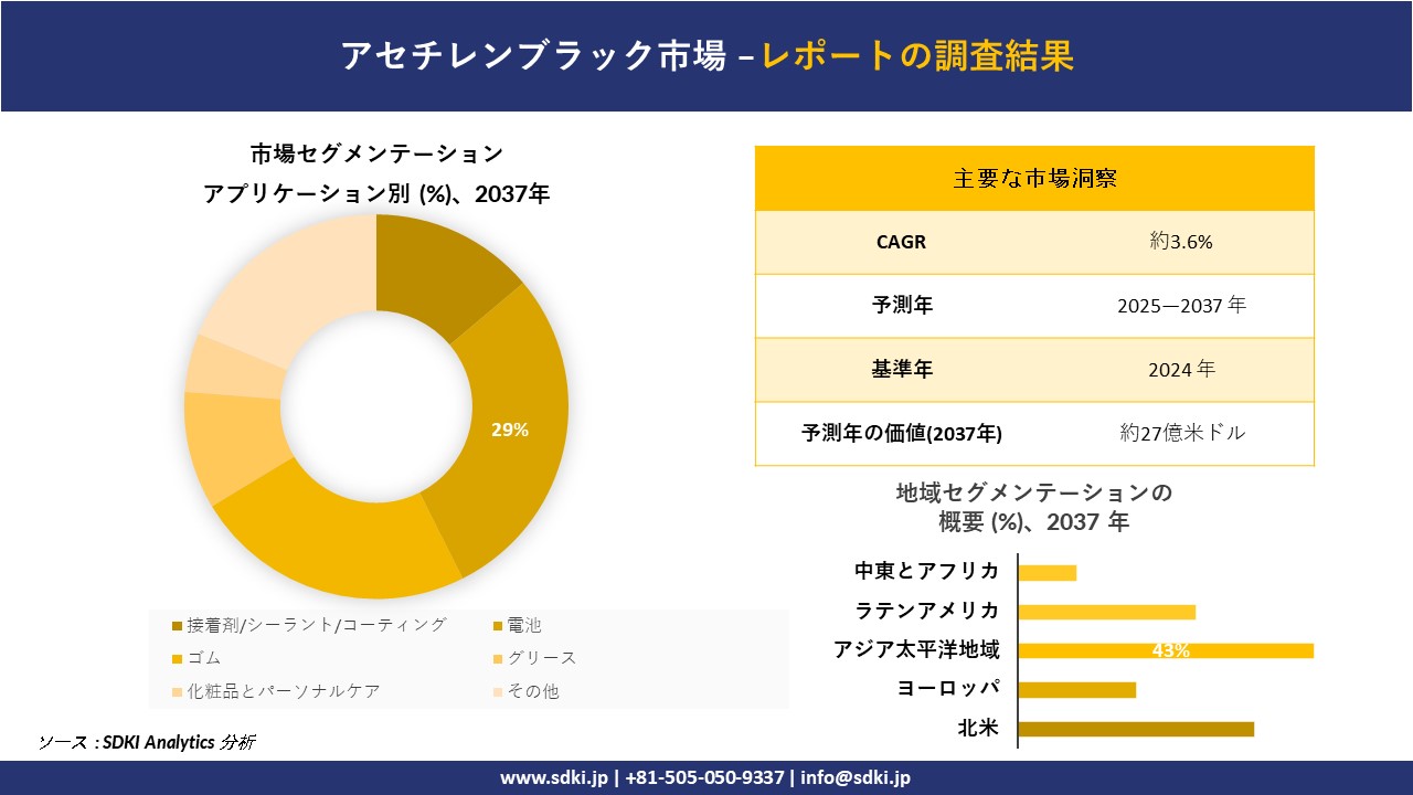 東京都渋谷区、2025年01月18日:SDKI Analyticsはこのほど、「アセチレンブラック市場に関する調査レポート : 予測2025―2037年」を発行しました。調査レポートは、アセチレンブラック市場の成長に貢献する統計的および分析的アプローチに焦点を当てています。当社の読者は、現在の市場シナリオに関する明確なイメージを得るとともに、詳細な調査レポートで提供される主要な業界の洞察から将来の傾向についても理解します。アセチレンブラックに関するこの調査レポートは、一次調査方法と二次調査方法の両方を利用して、市場の成長に伴う現在および将来の市場動向を分析します。