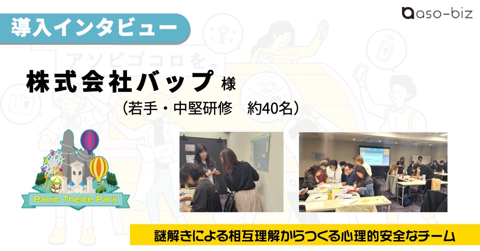 株式会社アソビズ(本社: 神奈川県横浜市)は、コンテンツ事業配信等をおこなう株式会社バップ(本社: 東京都千代田区)に対して、ゲーミフィケーション研修「パニックテーマパーク」を実施しました。