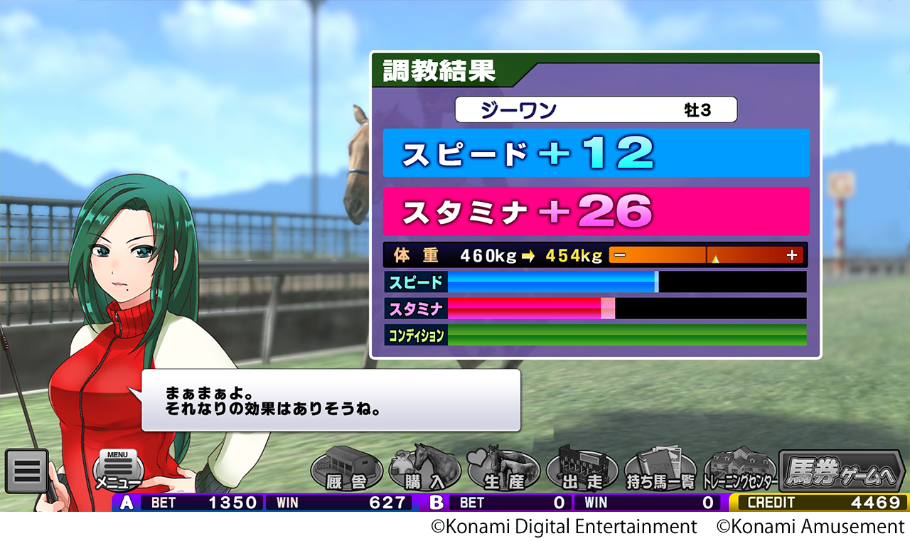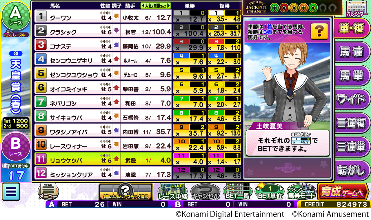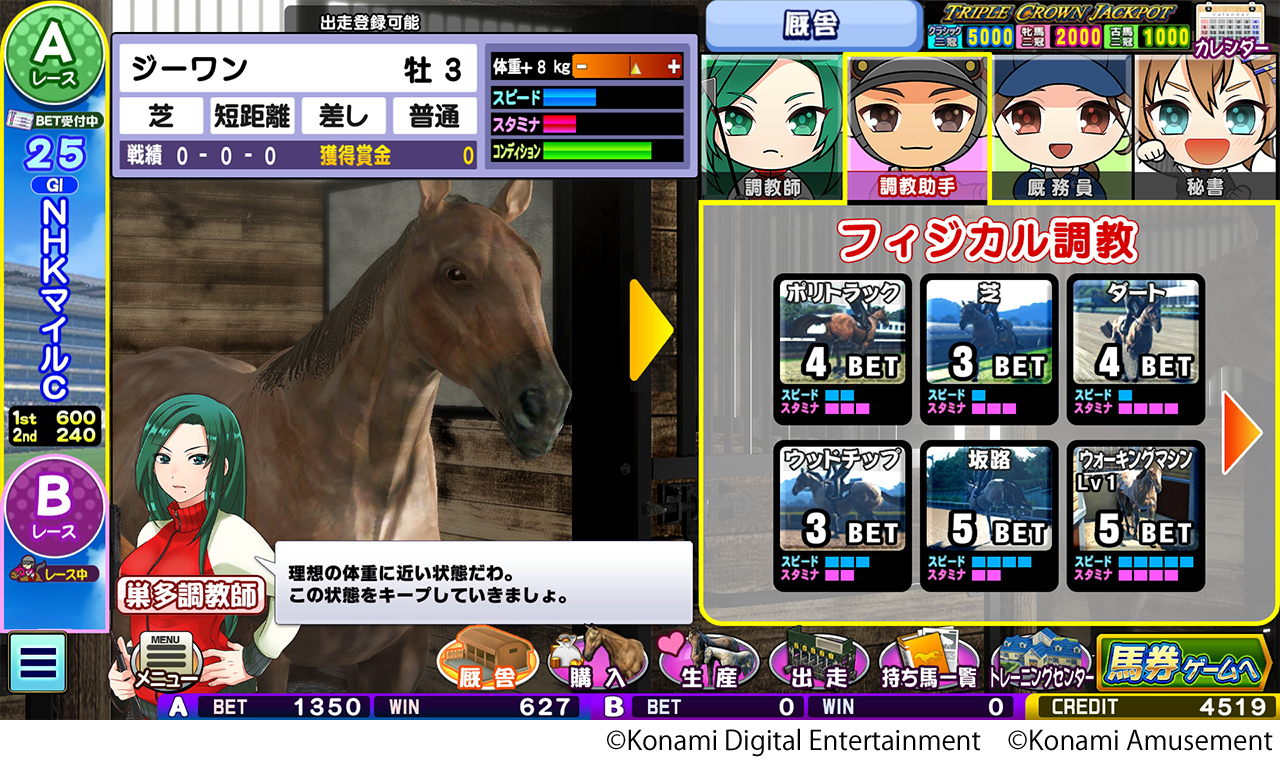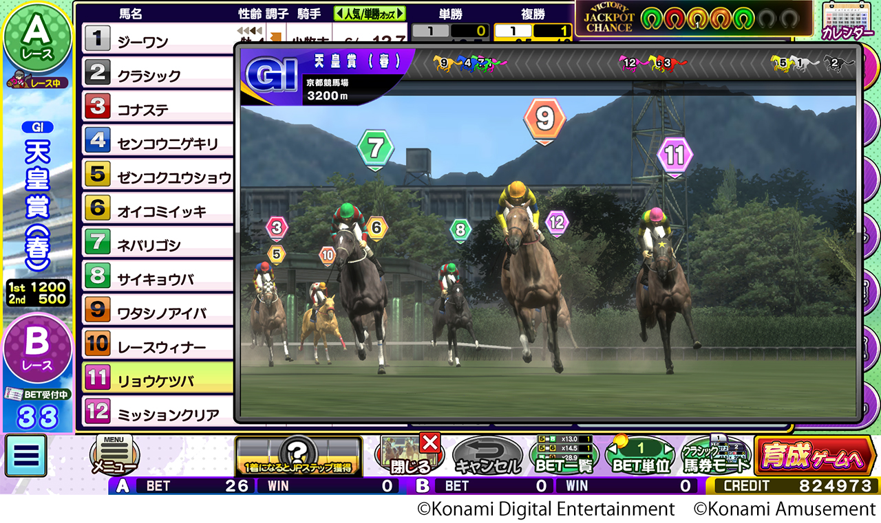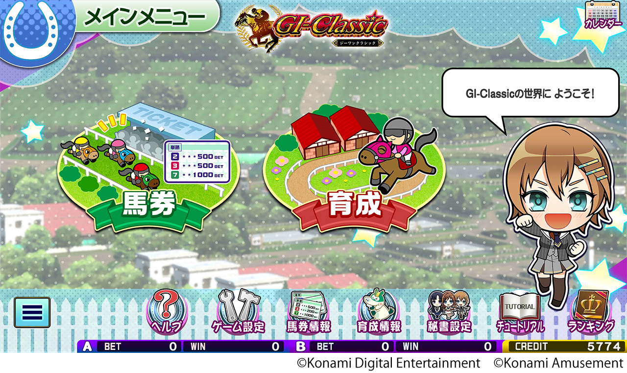 ダウンロードコンテンツ「GI-Classic」は、レースの結果を予想する「馬券ゲーム」と、所有する馬を調教してレースに出走させる「育成ゲーム」をプレーでき、アーケード版と同様に競馬メダルゲームの面白さをお楽しみいただけます。