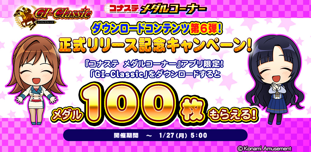 『コナステ メダルコーナー』アプリでは、アプリ内にある「GI-Classic」をダウンロードするとメダル100枚がもらえる『ダウンロードコンテンツ第6弾「GI-Classic」正式リリース記念キャンペーン!』を開催しています。
