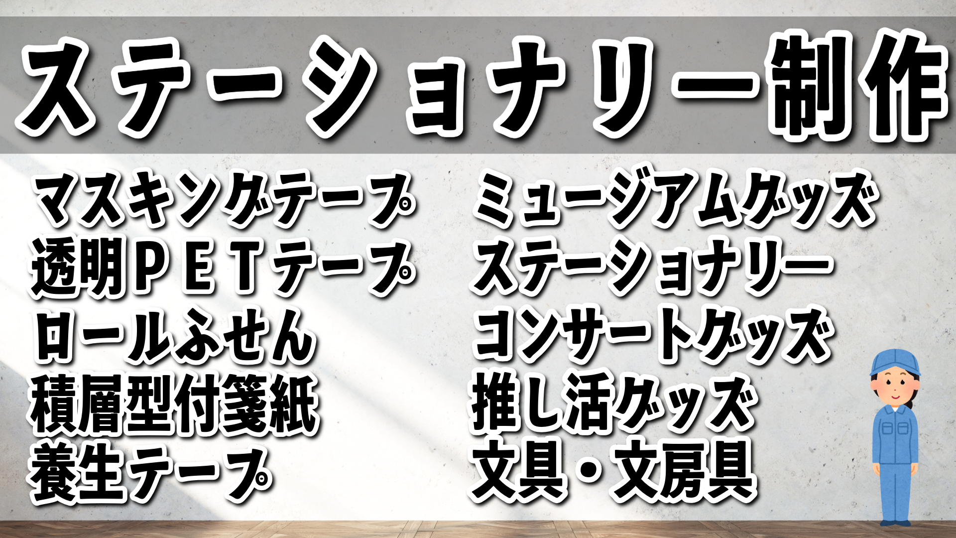 ロール付箋、マスキングテープ、透明PETテープ、養生テープ、巻物型付箋紙、積層型付箋紙でのステーショナリー制作が可能です。コンサートグッズ制作、ライブグッズ制作、アーティストグッズ制作、野球グッズ制作、サッカーグッズ制作、バスケグッズ制作、バレーボールグッズ制作、空手グッズ制作、体操グッズ制作、卓球グッズ制作、柔道グッズ制作、剣道グッズ制作、ミュージアムグッズ制作、美術館グッズ制作、美術展グッズ制作、博物館グッズ制作、科学館グッズ制作、動物園グッズ制作、水族館グッズ制作、水族館グッズ制作、アニメグッズ制作、キャラクターグッズ制作、ノベルティグッズ制作が可能です。JANシール貼り、証紙貼りが可能です。カートンラベル貼り可能です。全国発送可能です。専属担当や匠カスタマイズ仕様マイスターが、商品企画、デザイン、版下データご作成、DTP、ご入稿、印刷、加工、進行管理、生産管理、進捗管理、セット、梱包、等トータル提案(Proposal and Suggestion and Suggest and Recommend)and トータルサポート(total support)します。柔軟なサポートを心掛けております。実店舗での対面お打ち合わせも可能です。実店舗で、文具やステーショナリ―のリアルサンプルや、現物サンプルをご覧いただくことも可能です。