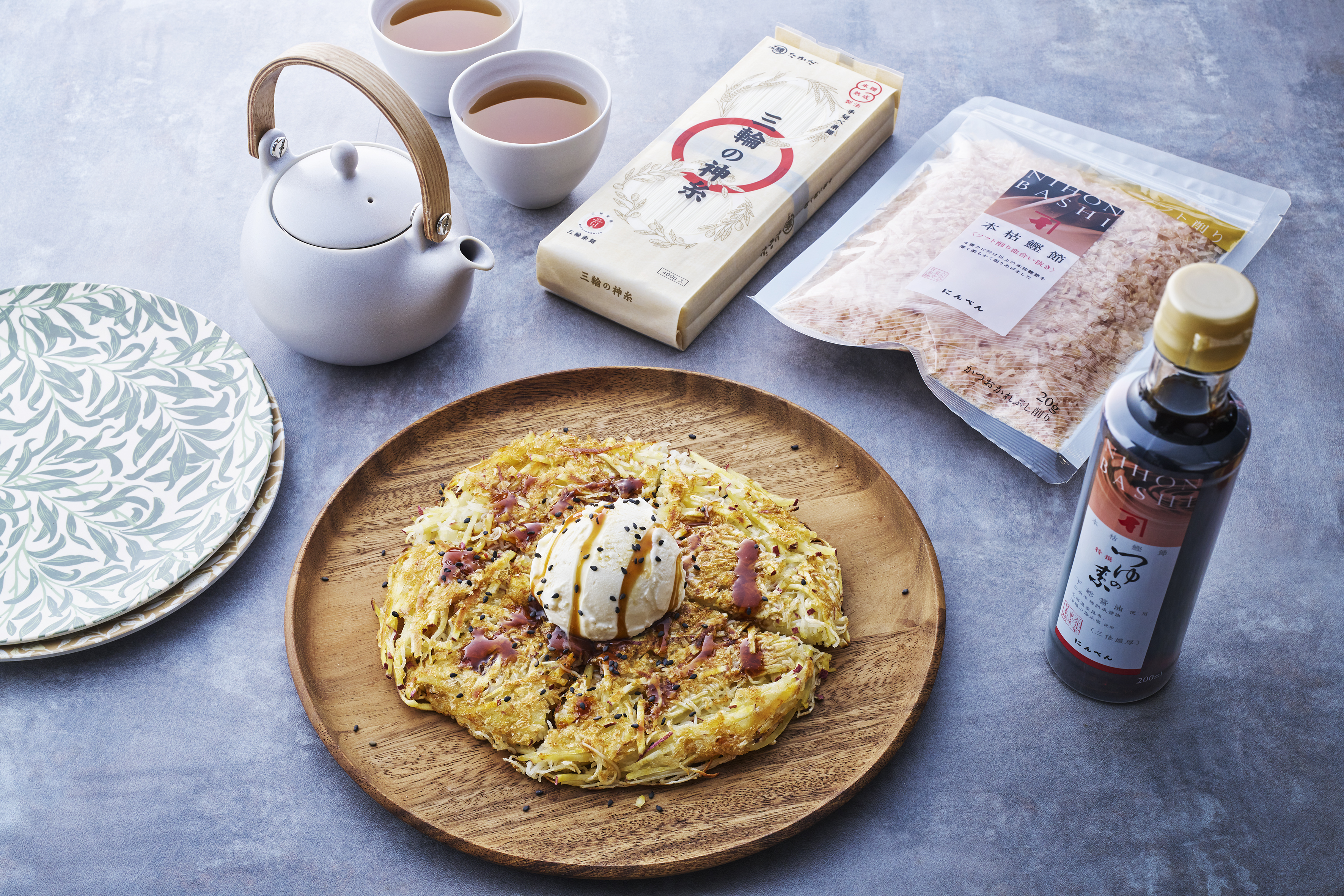 「鰹節さつまいも素麺ガレット みたらしソース」