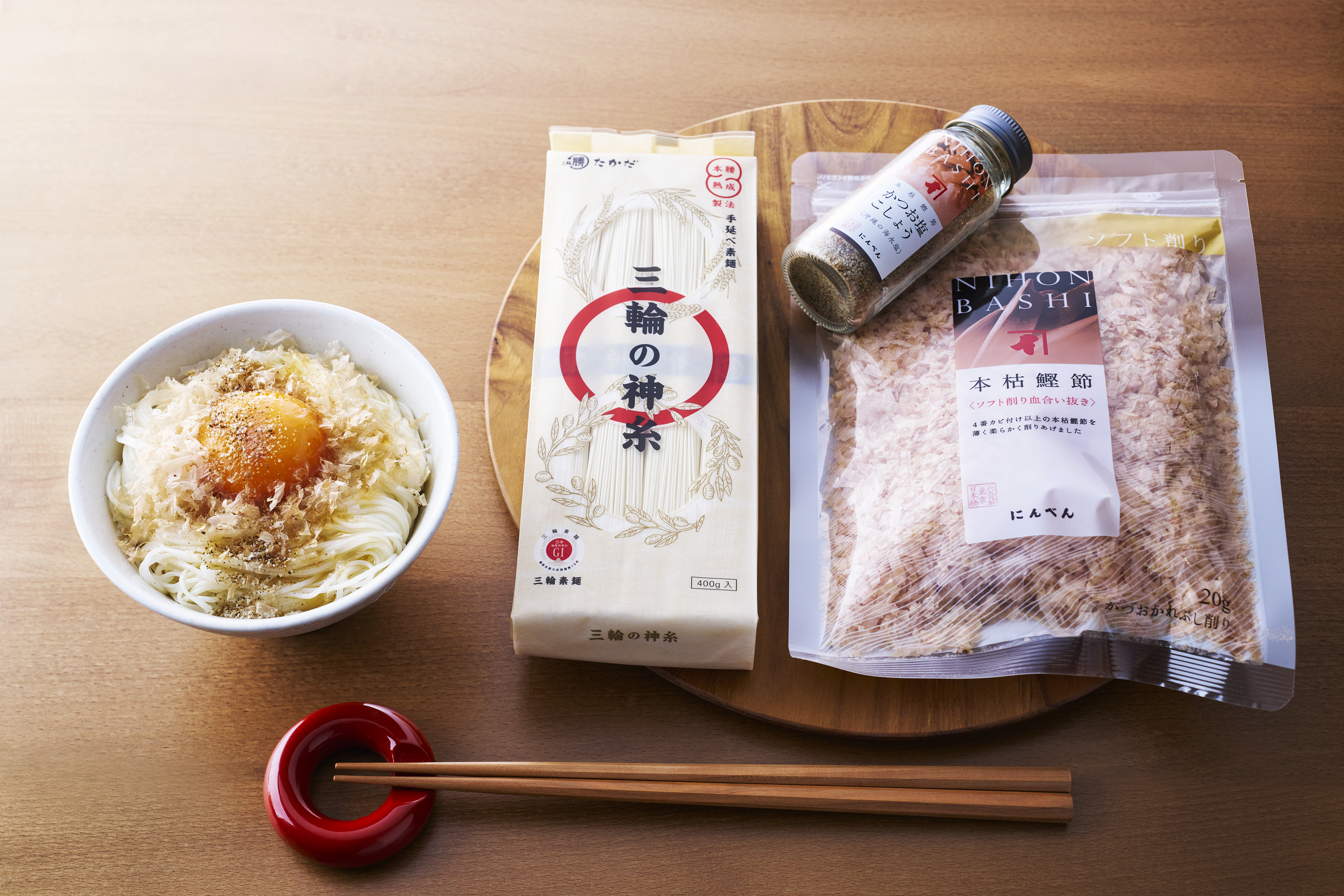 この度、創業300年以上の歴史を持つ「にんべん」様とのコラボレーションが実現したことを心より嬉しく思います。本企画を通じて、伝統ある三輪素麺と、にんべん様の本格的な鰹節だしの素晴らしさを組み合わせ、新しい「食」の可能性をお届けできることを誇りに感じています。