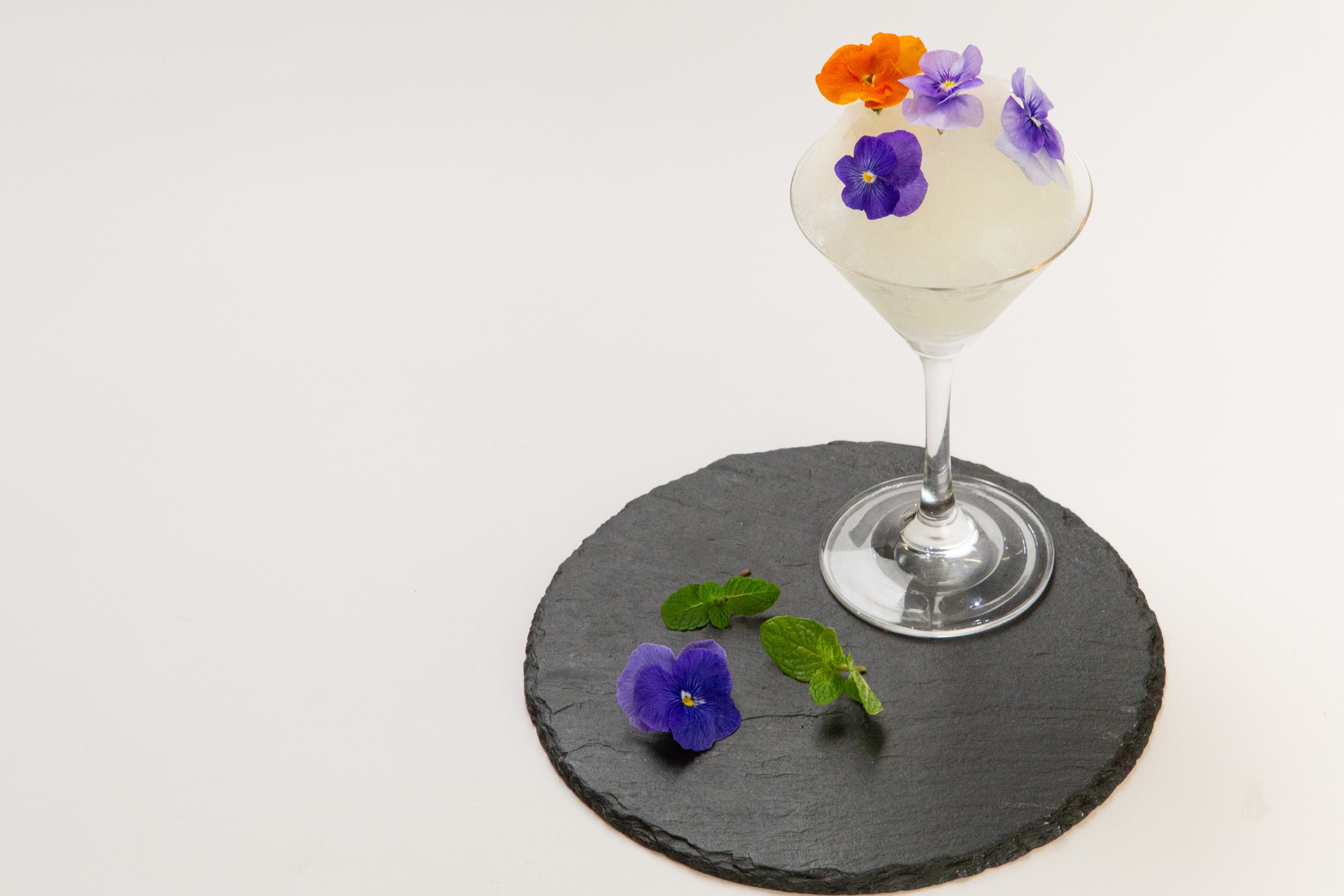 色のない世界で生まれた少女たちをイメージしたドリンク。華やかなエディブルフラワーと一緒に。